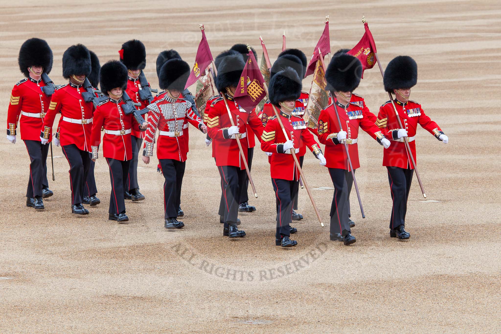 Major General's Review 2013: The 'Keepers of the Ground', guardsmen bearing marker flags for their respective regiments,march on to Horse Guards Parade.. Horse Guards Parade, Westminster, London SW1, United Kingdom, on 01 June 2013 at 09:54, image #21