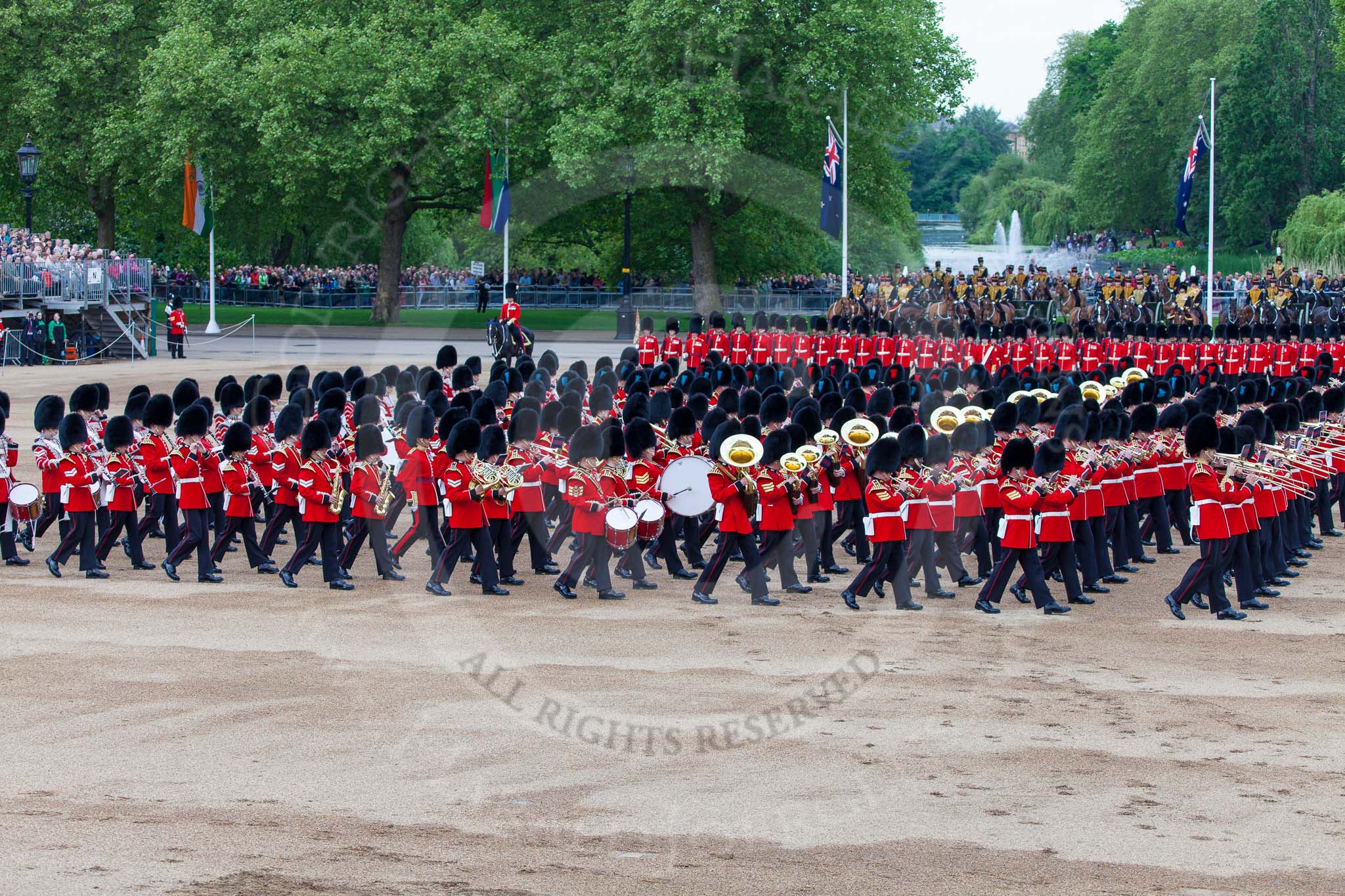 Major General's Review 2013: The Massed Band Troop begins with the slow march - the Waltz from Les Huguenots. The Field Officer, and behind him the Third and Fourth Division of the Sovereign's Escort, The Blues and Royals, can be seen on top of the image.. Horse Guards Parade, Westminster, London SW1, United Kingdom, on 01 June 2013 at 11:08, image #320
