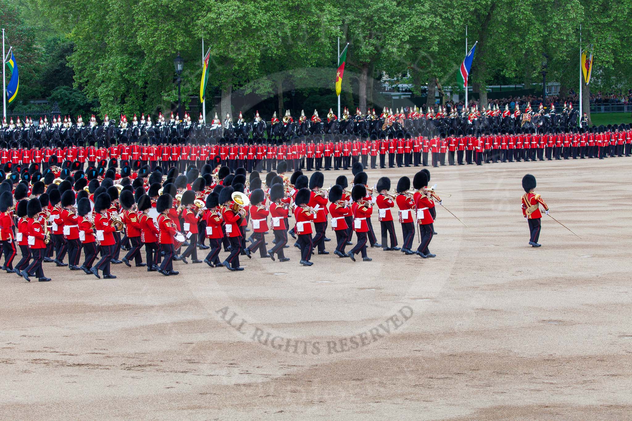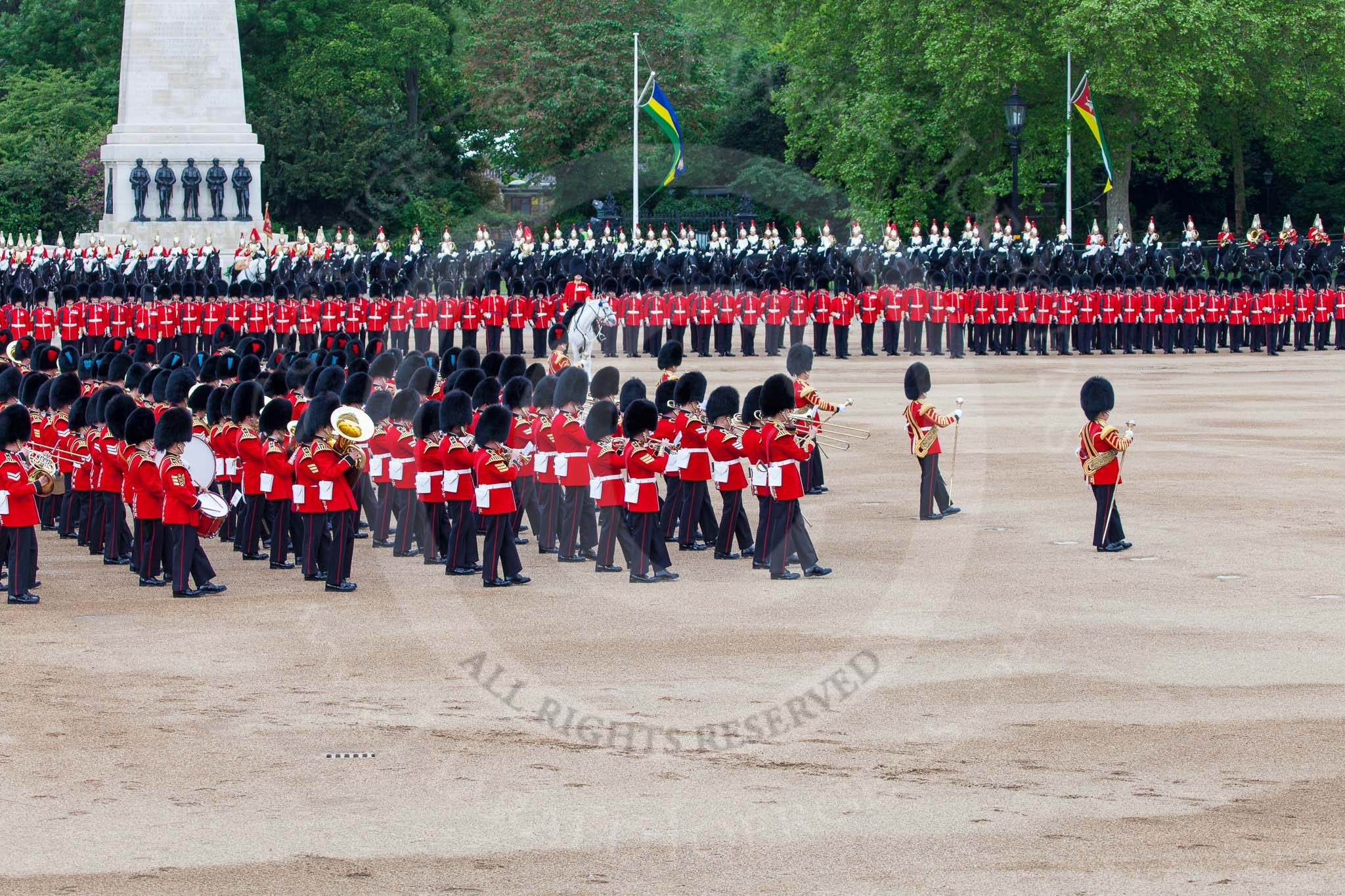 Major General's Review 2013: The Massed Band Troop begins with the slow march - the Waltz from Les Huguenots. No. 1 Guard, the Escort for the Colour with the Ensign in the centre, and the King's Troop Royal Horse Artillery can be seen on top of the image.. Horse Guards Parade, Westminster, London SW1, United Kingdom, on 01 June 2013 at 11:08, image #317