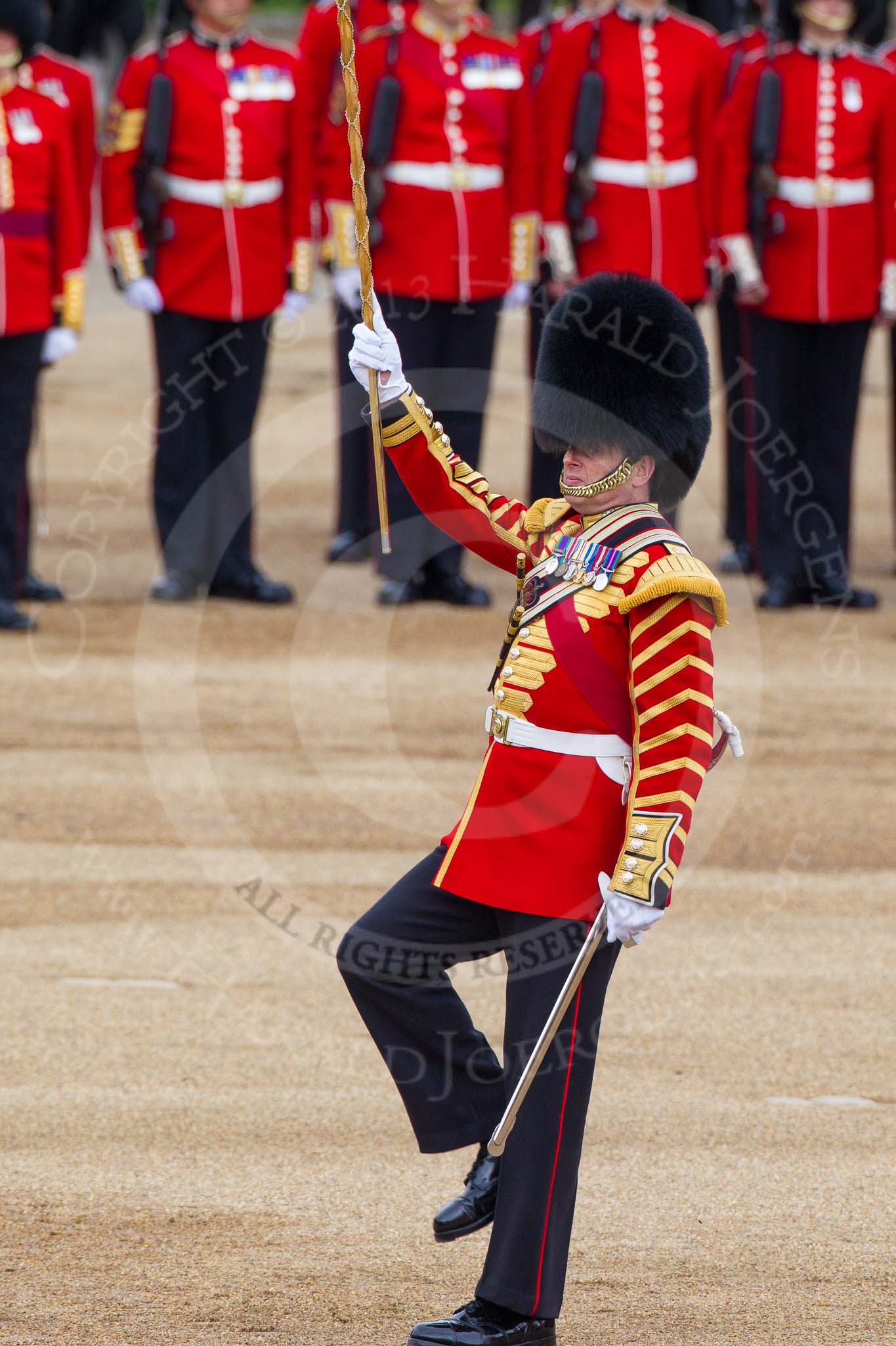 Major General's Review 2013: Drum Major Neill Lawman, Welsh Guards, leading the Band of the Welsh Guards.. Horse Guards Parade, Westminster, London SW1, United Kingdom, on 01 June 2013 at 11:10, image #324