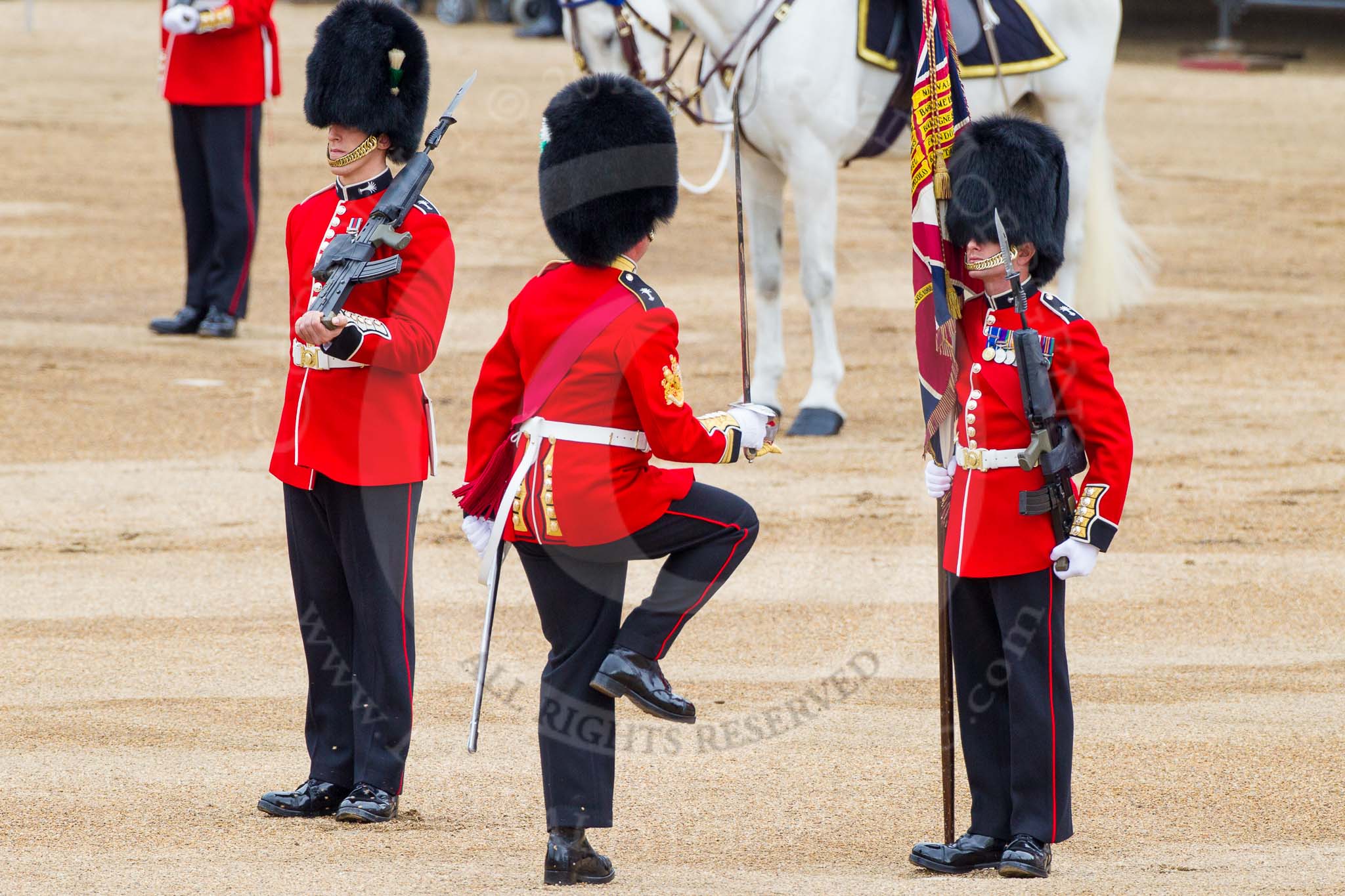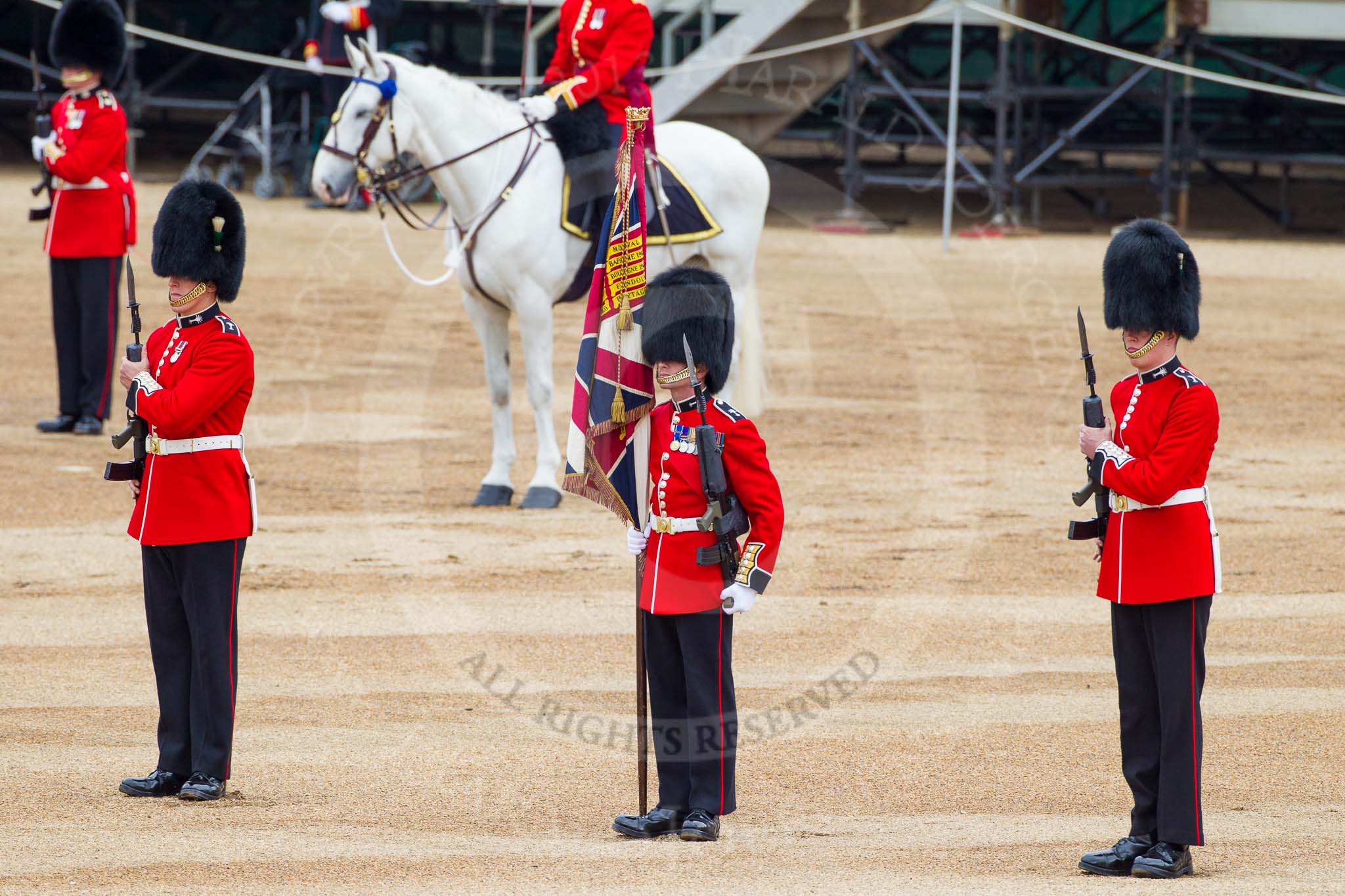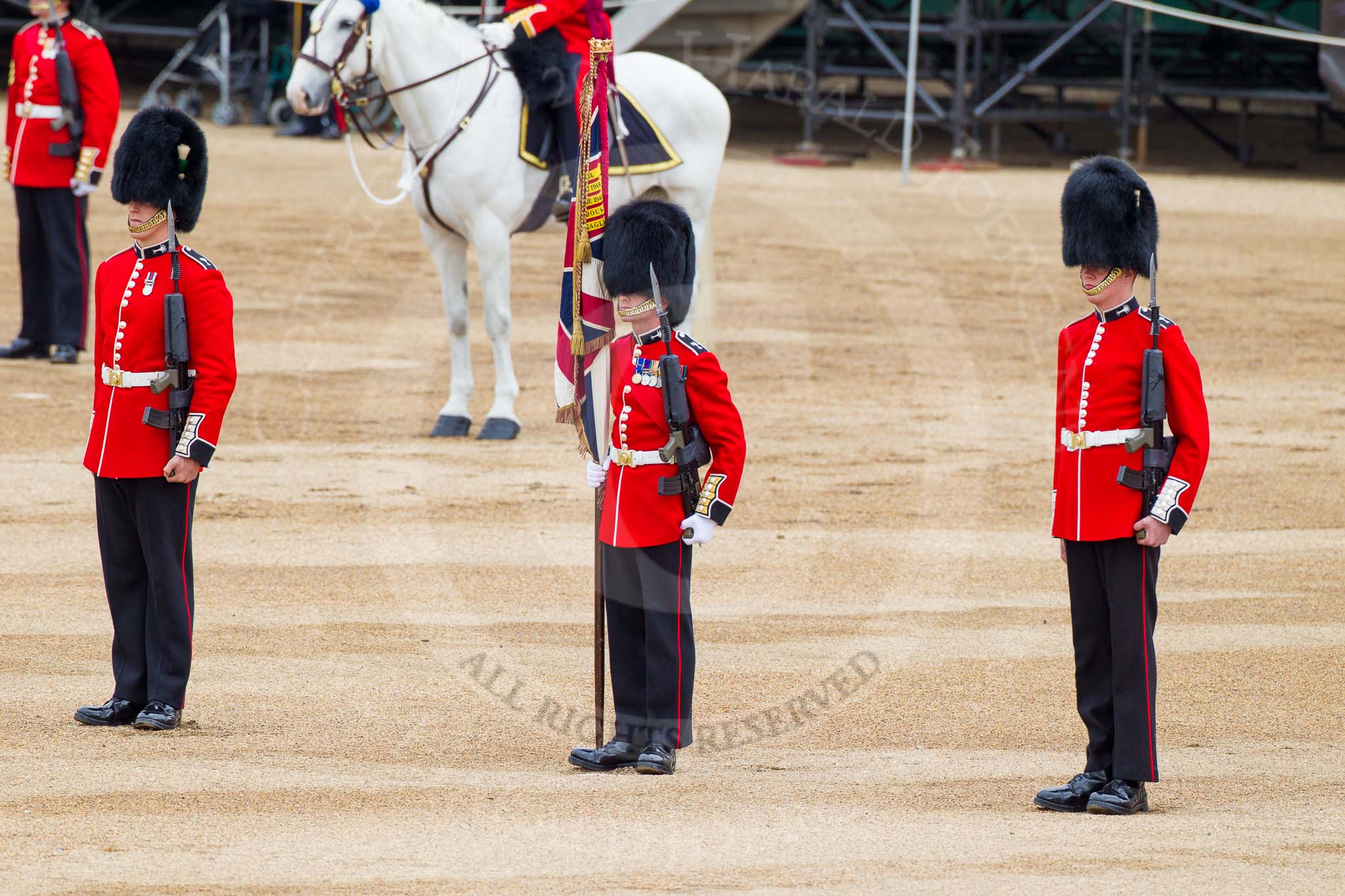 Major General's Review 2013: About to hand over the Colour - Colour Sergeant R J Heath, Welsh Guards, with the two (unfortunately unnamed) sentries.. Horse Guards Parade, Westminster, London SW1, United Kingdom, on 01 June 2013 at 11:17, image #383