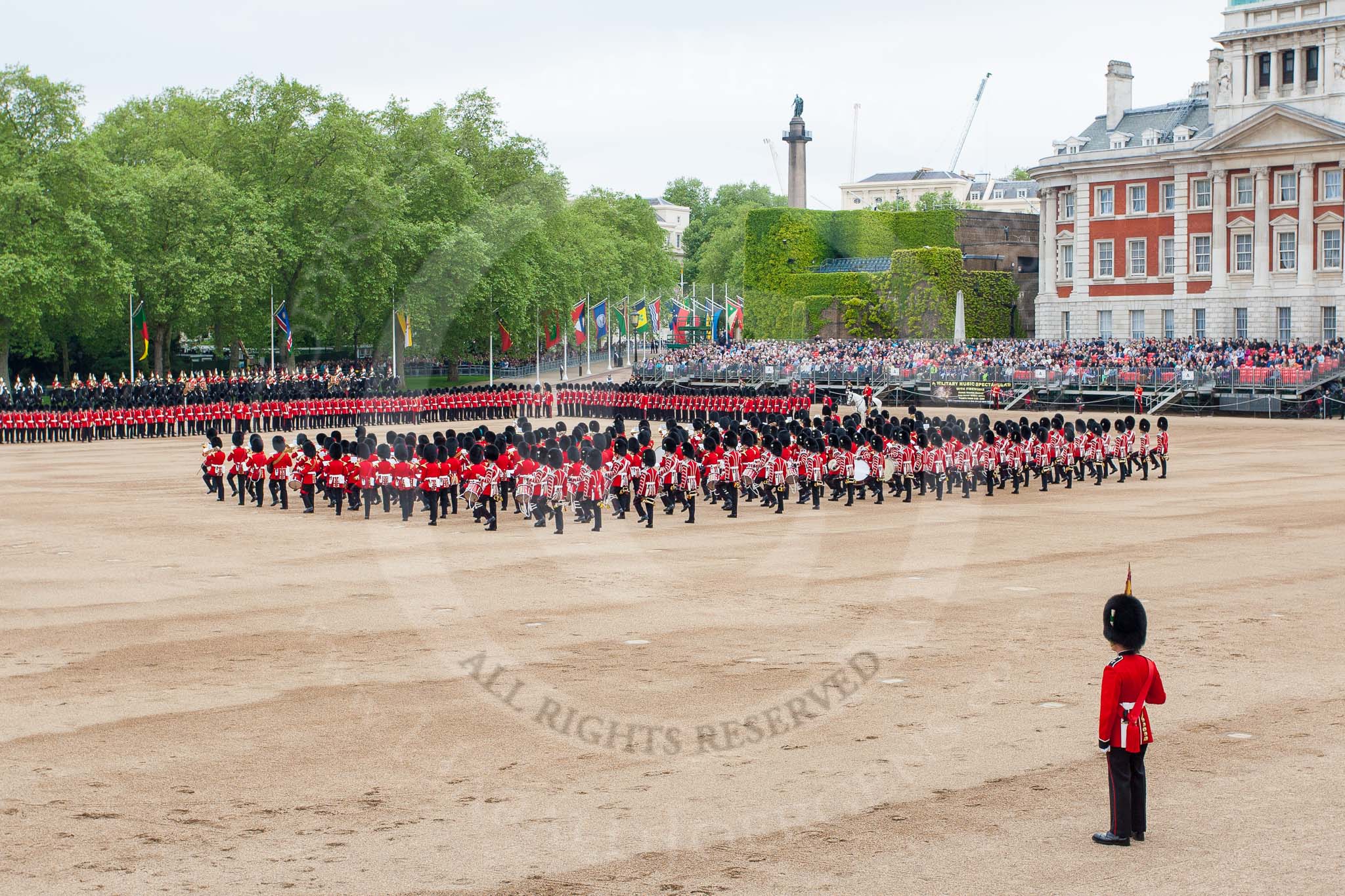 Major General's Review 2013: The men of No. 1 Guard (Escort for the Colour),1st Battalion Welsh Guards are moving into a new formation, facing the Colour Party on the other side of Horse Guards Parade.. Horse Guards Parade, Westminster, London SW1, United Kingdom, on 01 June 2013 at 11:16, image #380