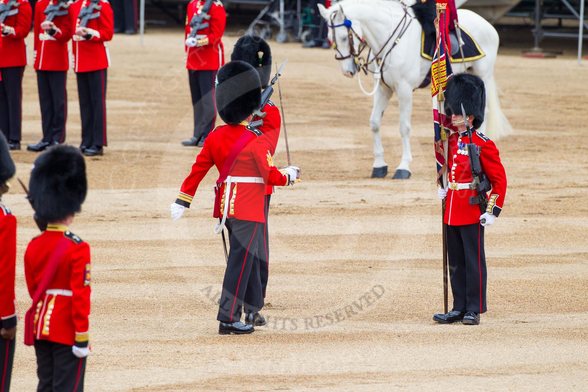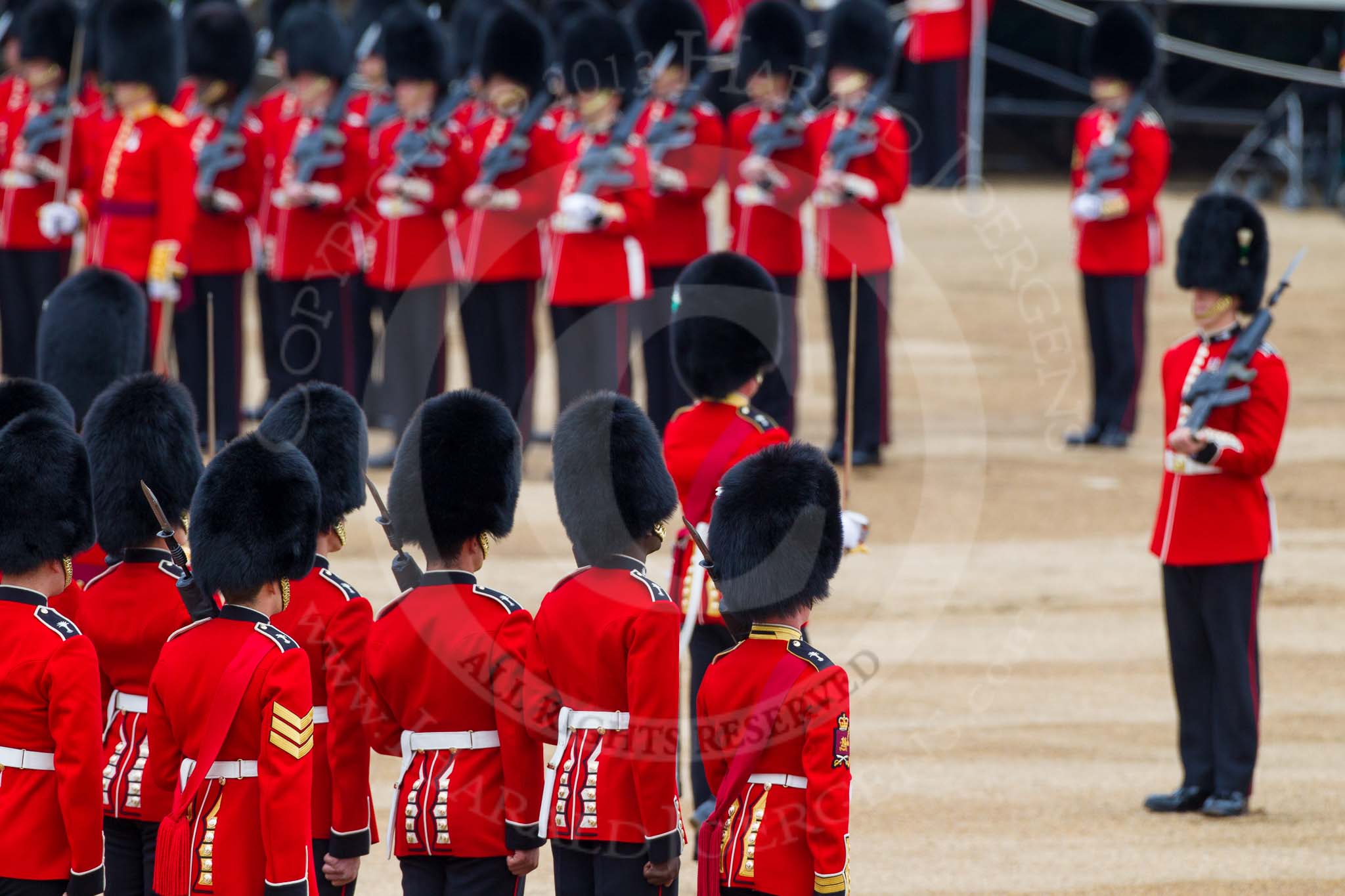 Major General's Review 2013: The men of No. 1 Guard (Escort for the Colour),1st Battalion Welsh Guards are moving into a new formation, facing the Colour Party on the other side of Horse Guards Parade.. Horse Guards Parade, Westminster, London SW1, United Kingdom, on 01 June 2013 at 11:16, image #381