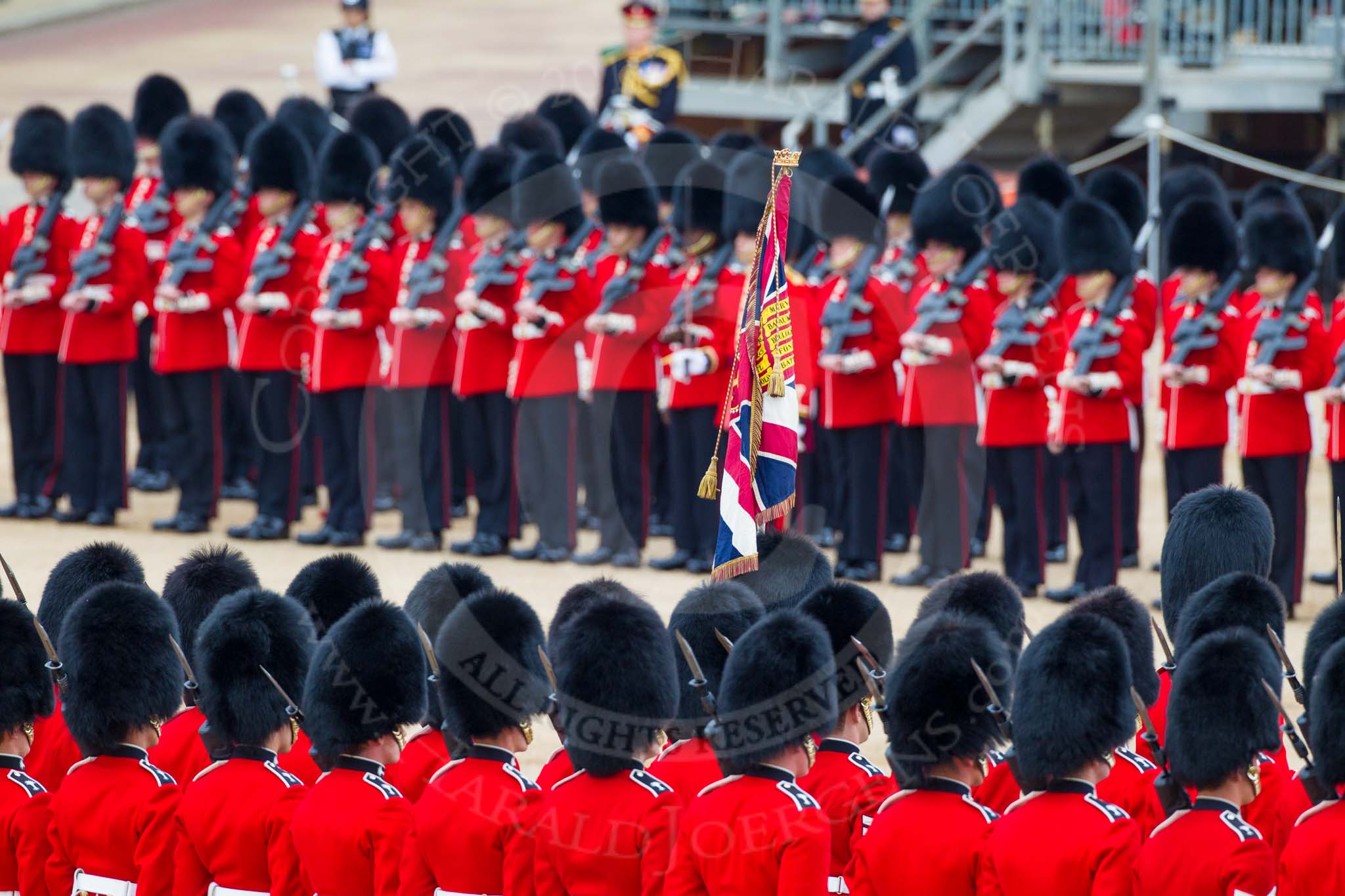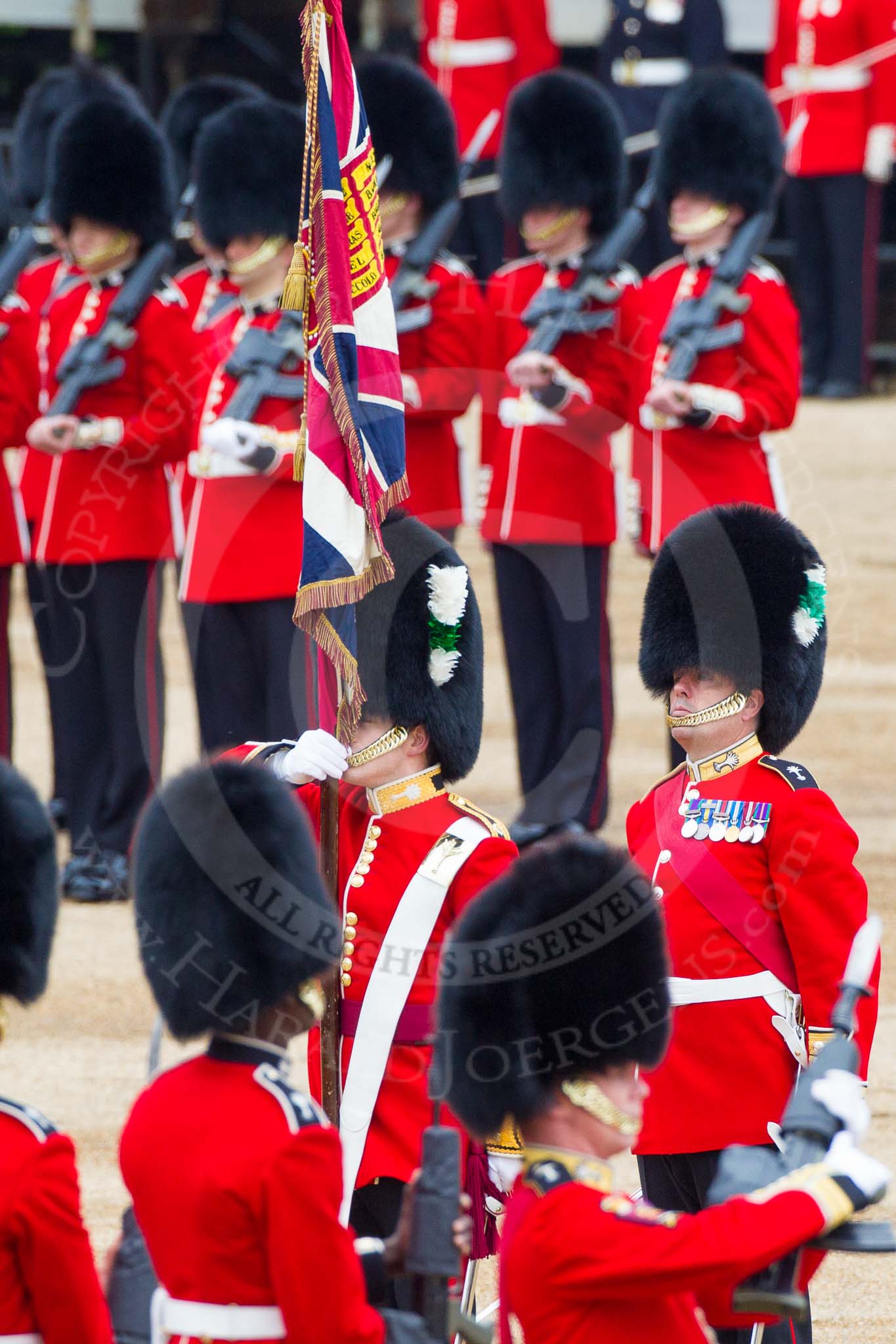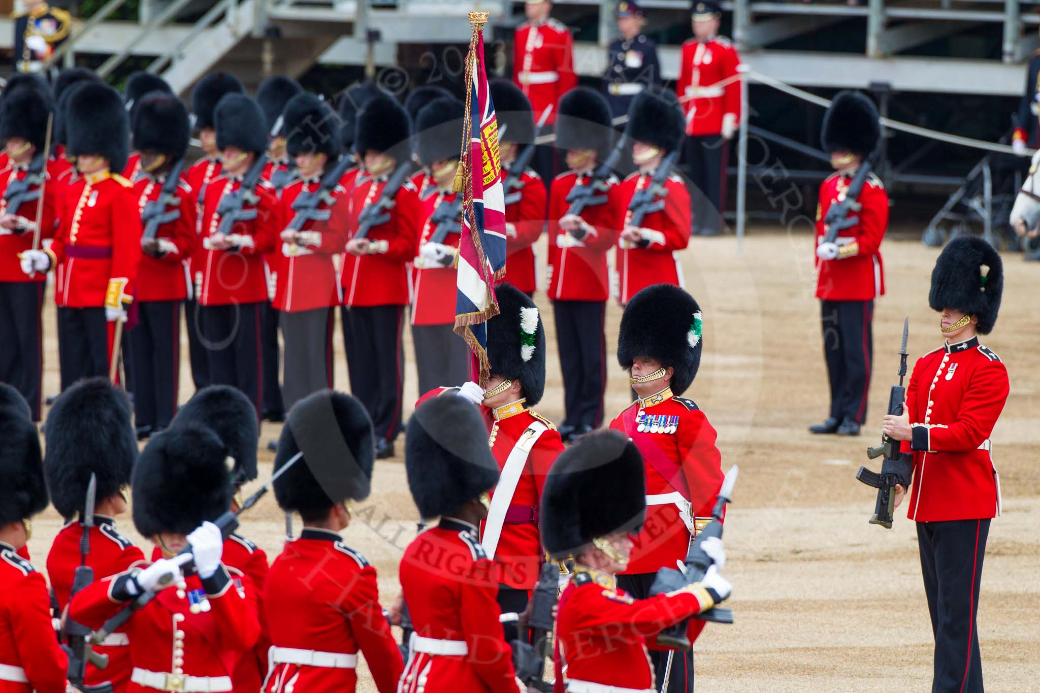 Major General's Review 2013: The Ensign, Second Lieutenant Joel Dinwiddle, in posession of the Colour, turns around to No. 1 Guard, now the Escort to the Colour.. Horse Guards Parade, Westminster, London SW1, United Kingdom, on 01 June 2013 at 11:20, image #408