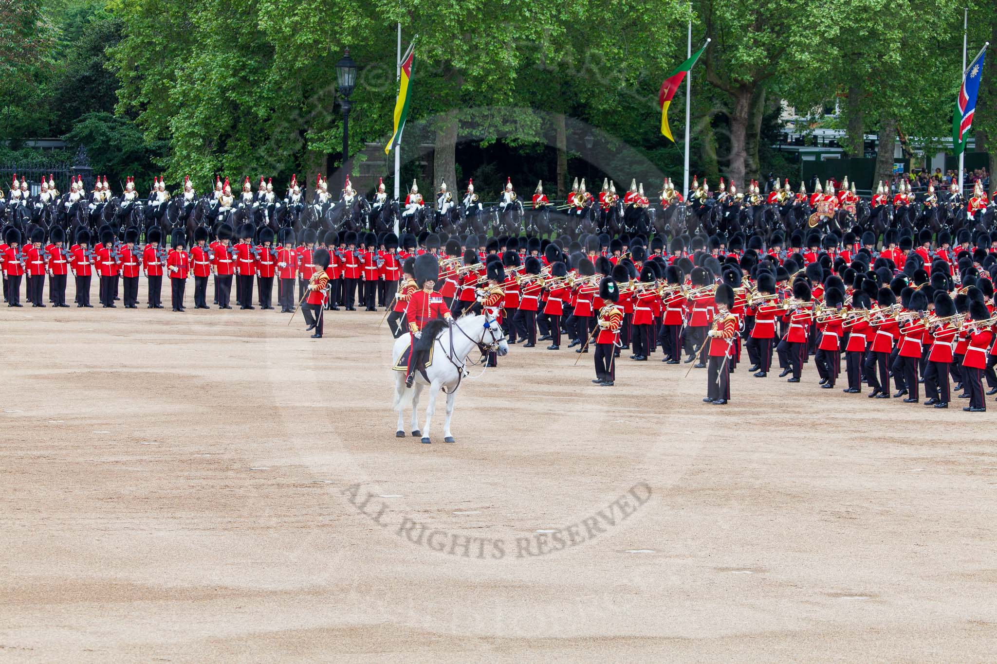 Major General's Review 2013: The Field Officer in Brigade Waiting, Lieutenant Colonel Dino Bossi, Welsh Guards, commanding "present arms" as the Escort to the Colour is starting the trooping of the Colour through the ranks.. Horse Guards Parade, Westminster, London SW1, United Kingdom, on 01 June 2013 at 11:22, image #417