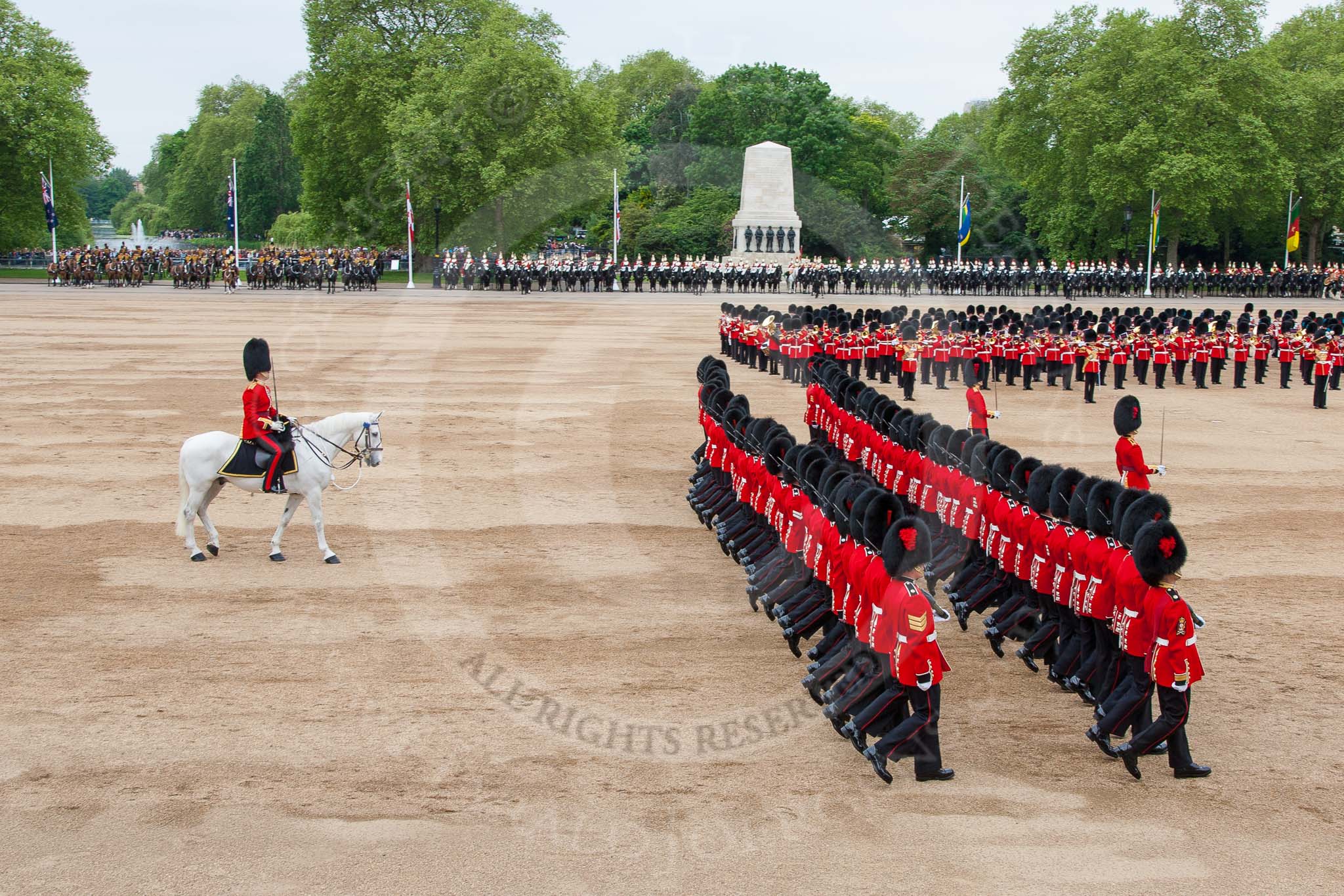 Major General's Review 2013: No. 1 Guard (Escort for the Colour),1st Battalion Welsh Guards, at the beginning of the March Past in Quick Time. Behind them The Blues and Royals and Life Guards of the Household Cavalry. The Field Officer returns to the head of the march past.. Horse Guards Parade, Westminster, London SW1, United Kingdom, on 01 June 2013 at 11:40, image #525