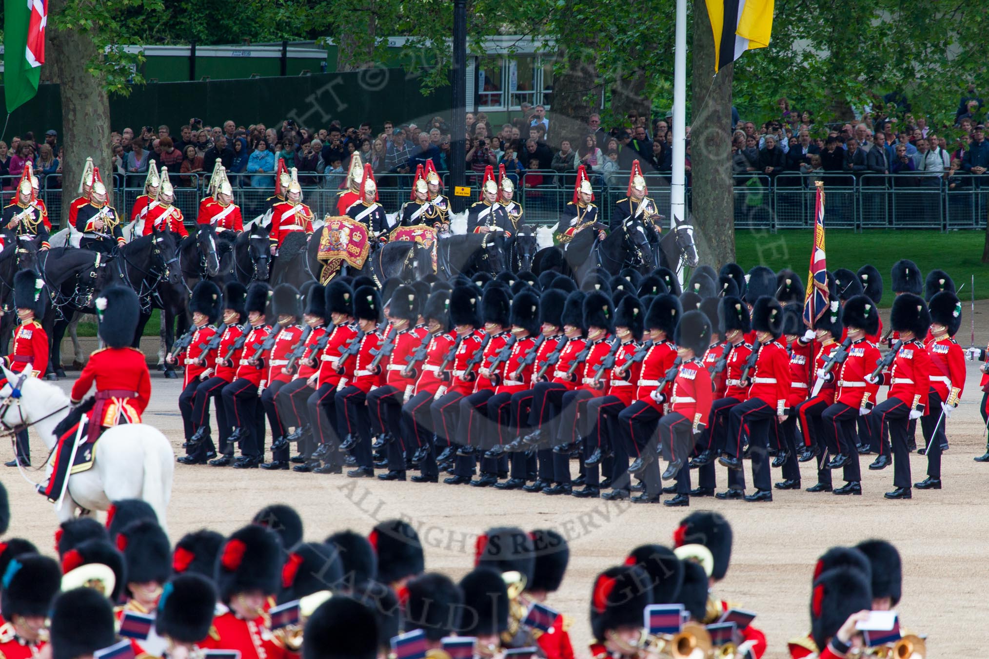Major General's Review 2013: No. 1 Guard (Escort for the Colour),1st Battalion Welsh Guards, at the beginning of the March Past in Quick Time. Behind them the Mounted Bands of the Household Cavalry.. Horse Guards Parade, Westminster, London SW1, United Kingdom, on 01 June 2013 at 11:39, image #520