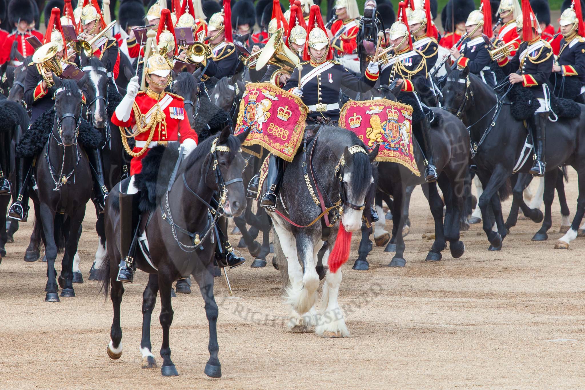 Major General's Review 2013: The Director of Music of the Household Cavalry, Major Paul Wilman, The Life Guards, during the Mounted Troops Ride Past. Behind him the kettle drummer from The Blues and Royals.. Horse Guards Parade, Westminster, London SW1, United Kingdom, on 01 June 2013 at 11:50, image #581
