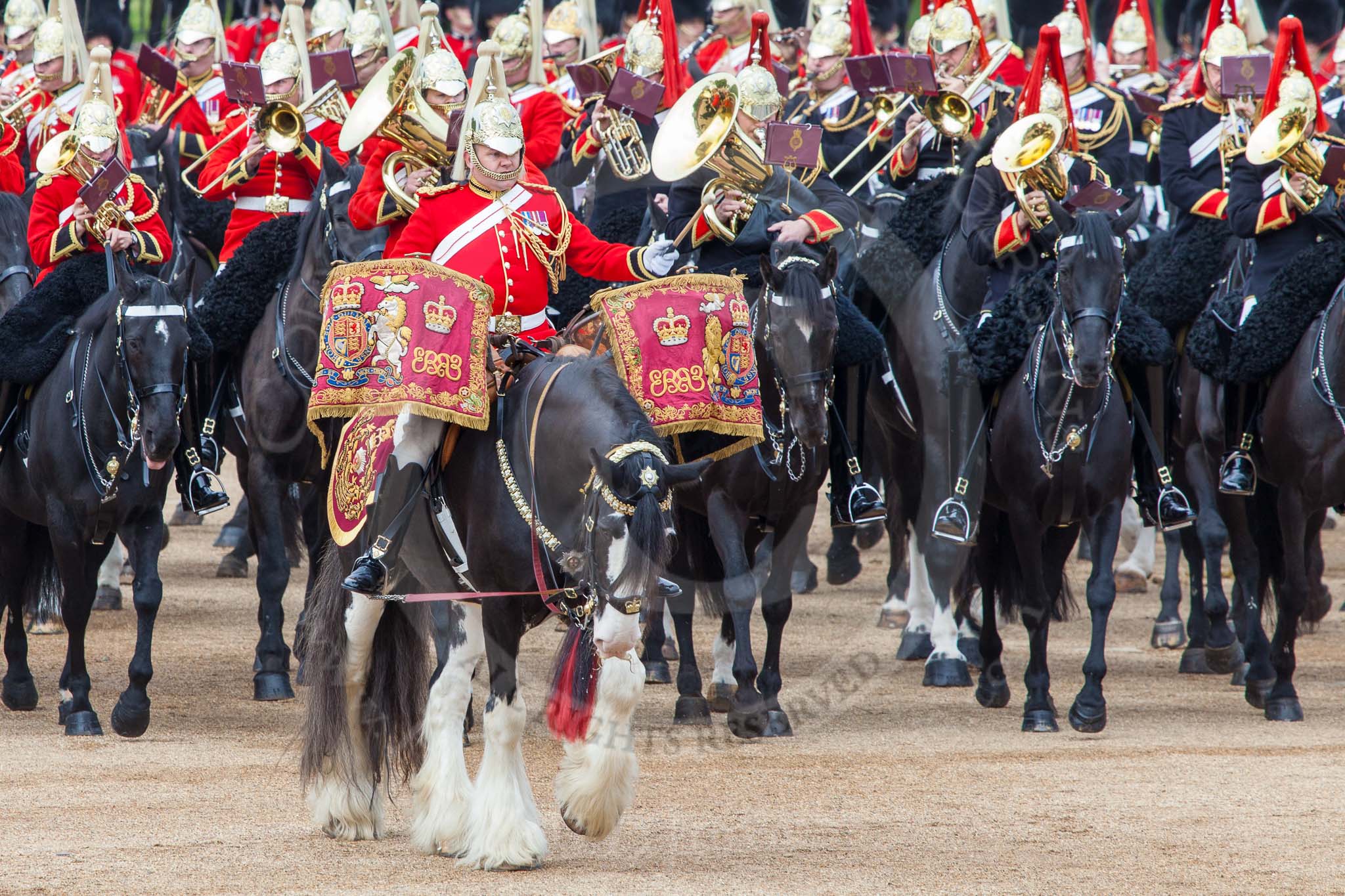 Major General's Review 2013: The Director of Music of the Household Cavalry, Major Paul Wilman, The Life Guards, during the Mounted Troops Ride Past. Behind him the kettle drummer from The Blues and Royals.. Horse Guards Parade, Westminster, London SW1, United Kingdom, on 01 June 2013 at 11:51, image #583