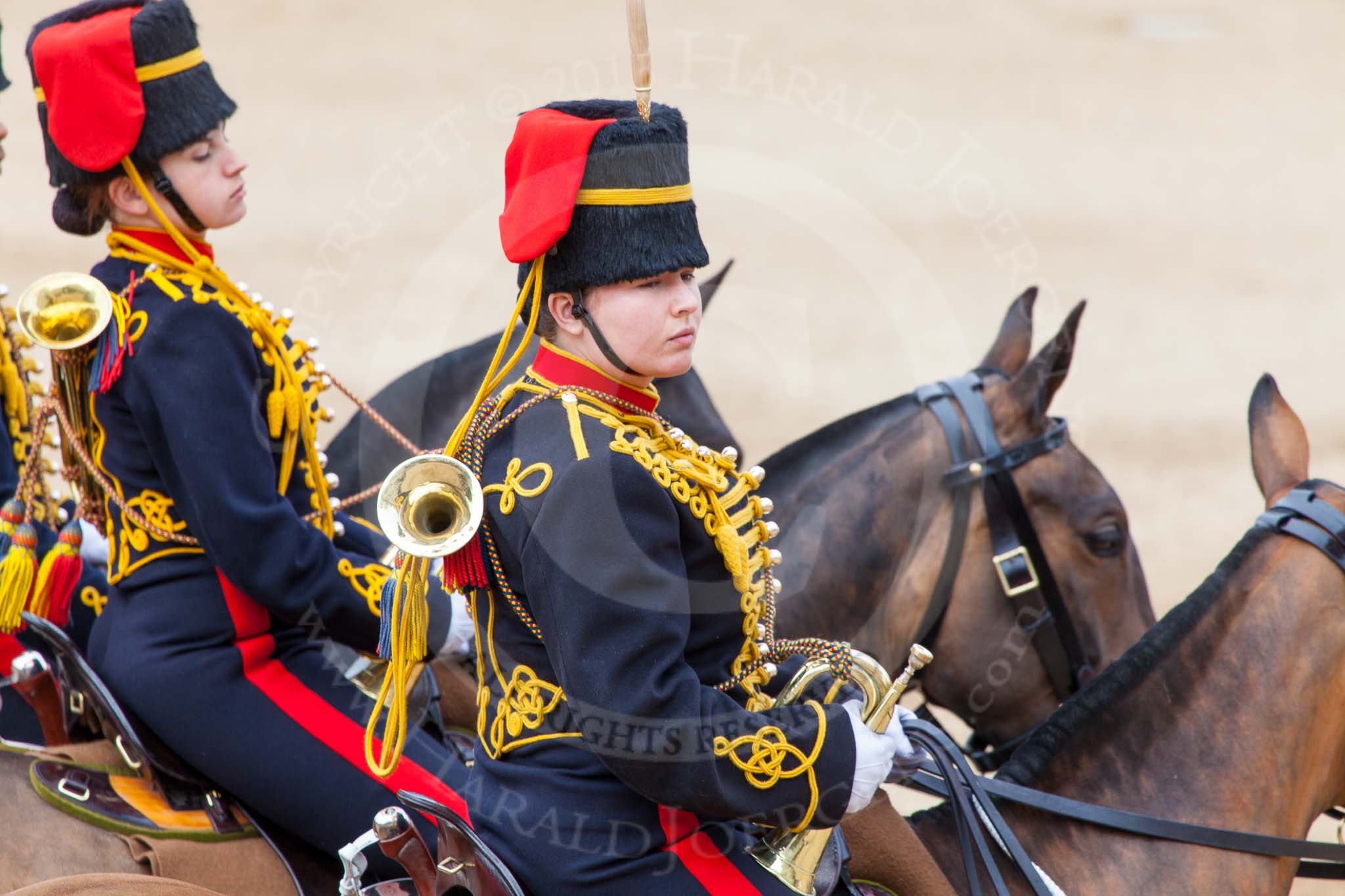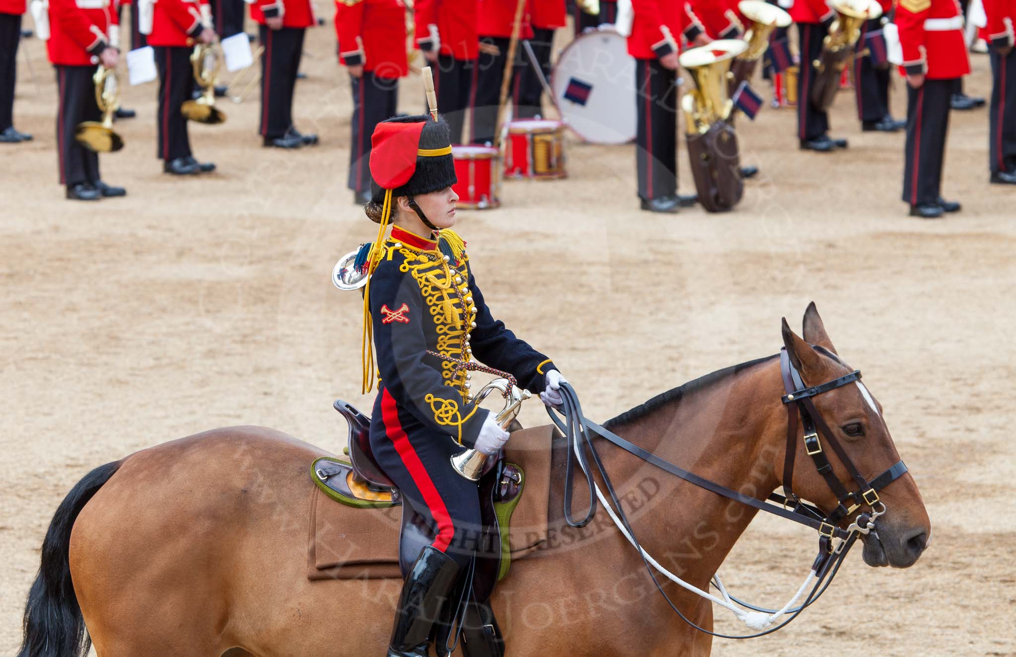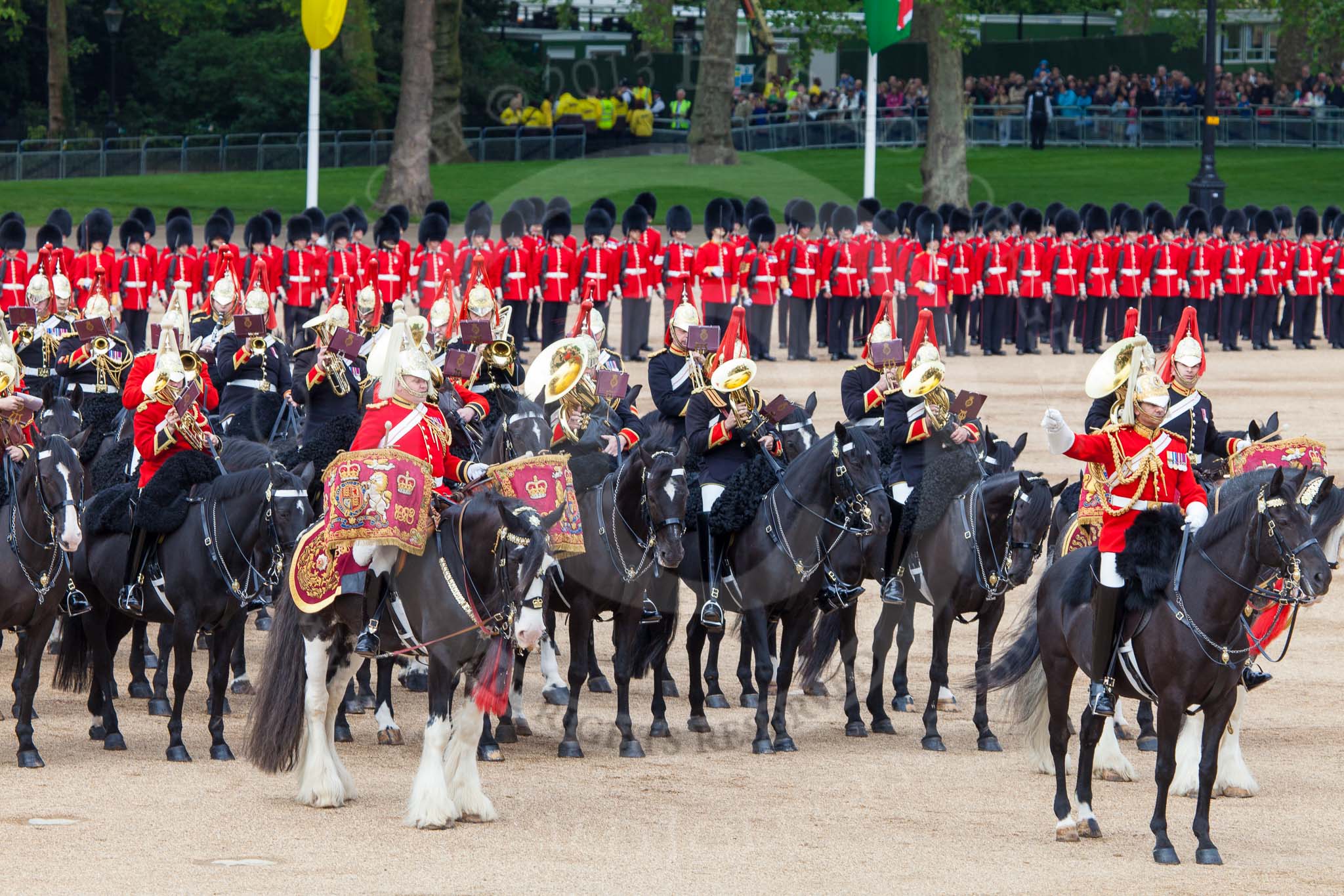Major General's Review 2013: The Director of Music of the Household Cavalry, Major Paul Wilman, The Life Guards, during the Mounted Troops Ride Past. Behind him the kettle drummer from The Blues and Royals.. Horse Guards Parade, Westminster, London SW1, United Kingdom, on 01 June 2013 at 11:51, image #588