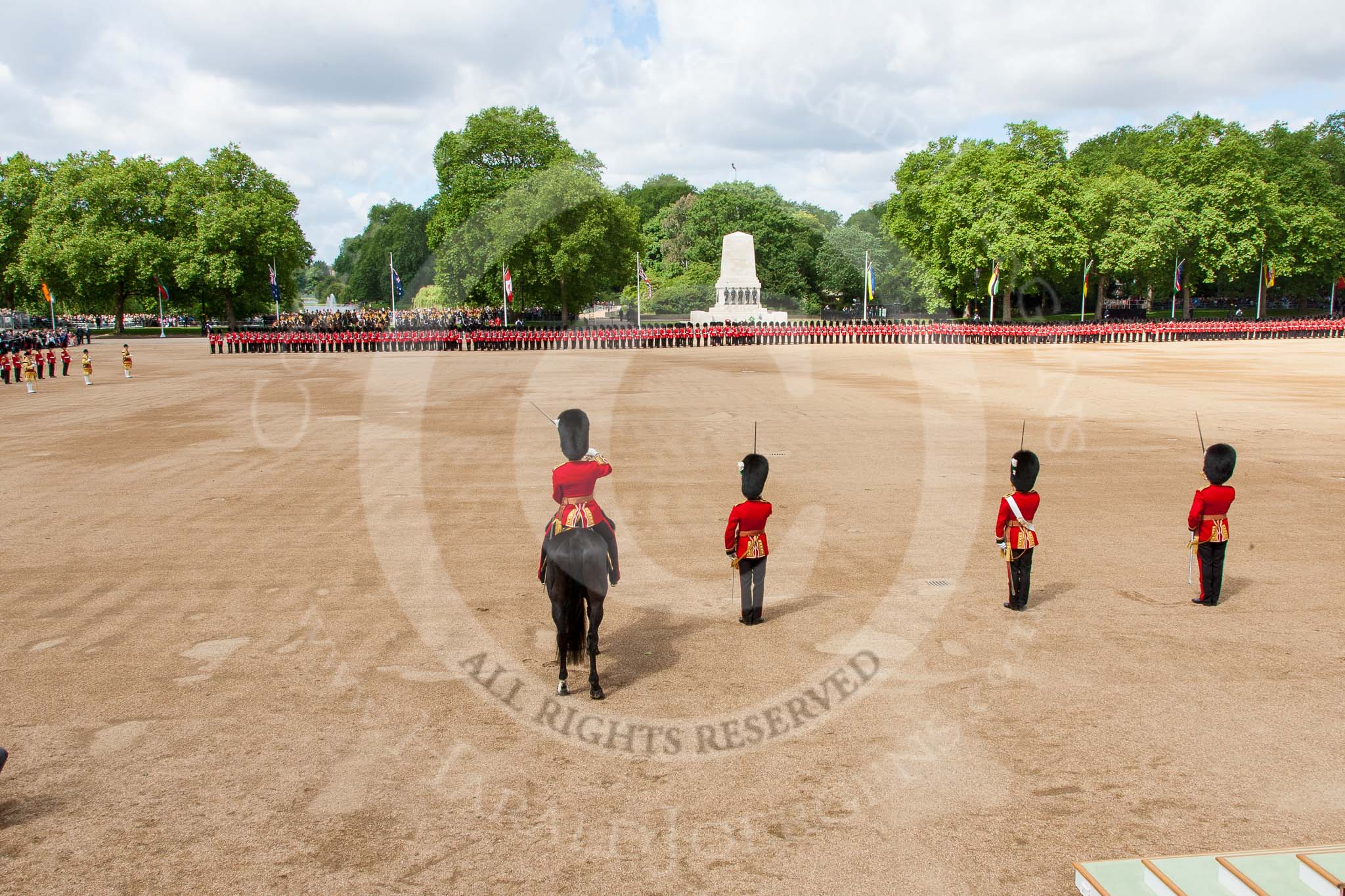Trooping the Colour 2013: The Major of the Parade, Major H G C Bettinson, Welsh Guards, is in position on the western side of the line of guardsmen. Image #165, 15 June 2013 10:42 Horse Guards Parade, London, UK
