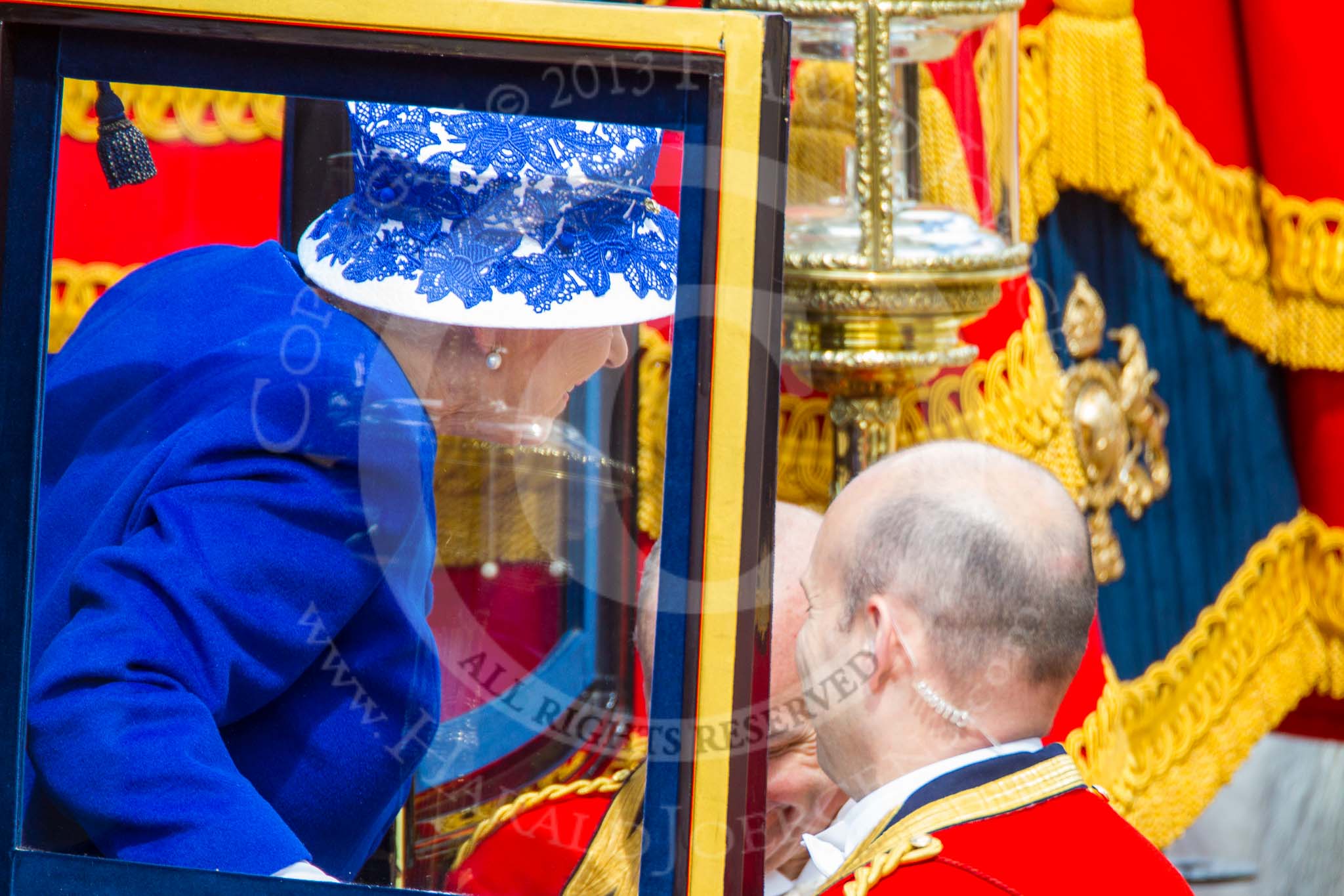 Trooping the Colour 2013: HM The Queen, smiling, as she is leaving the Glass Coach after the Inspection of the Line. Image #382, 15 June 2013 11:08 Horse Guards Parade, London, UK