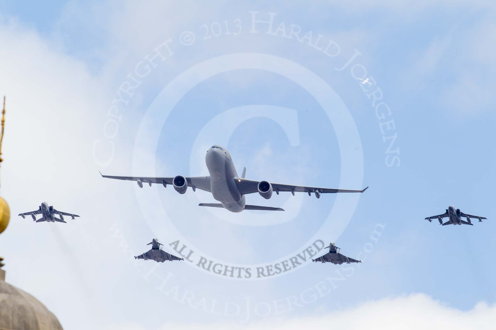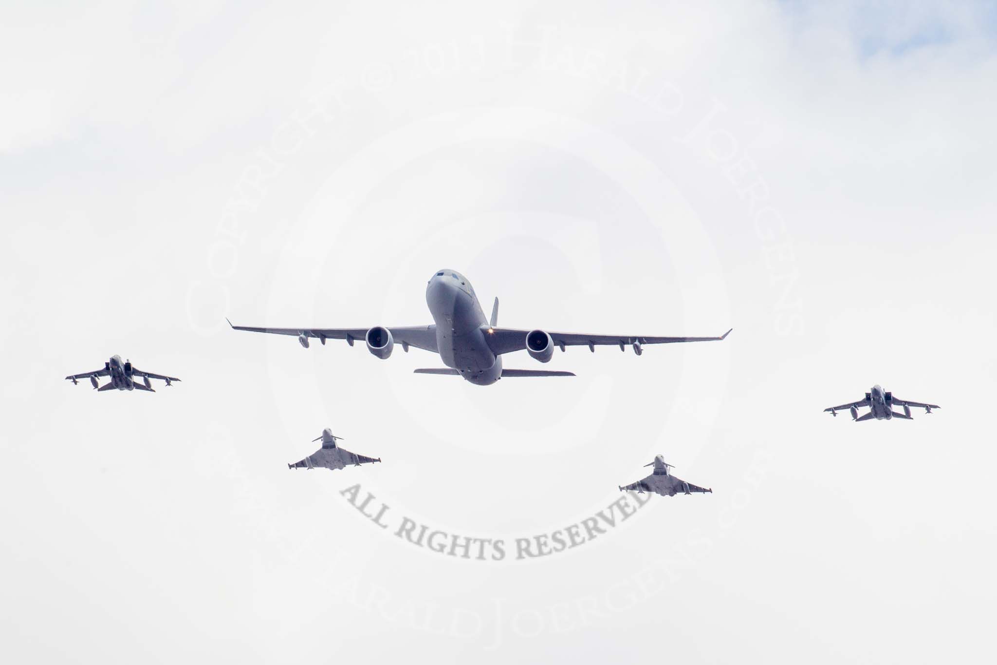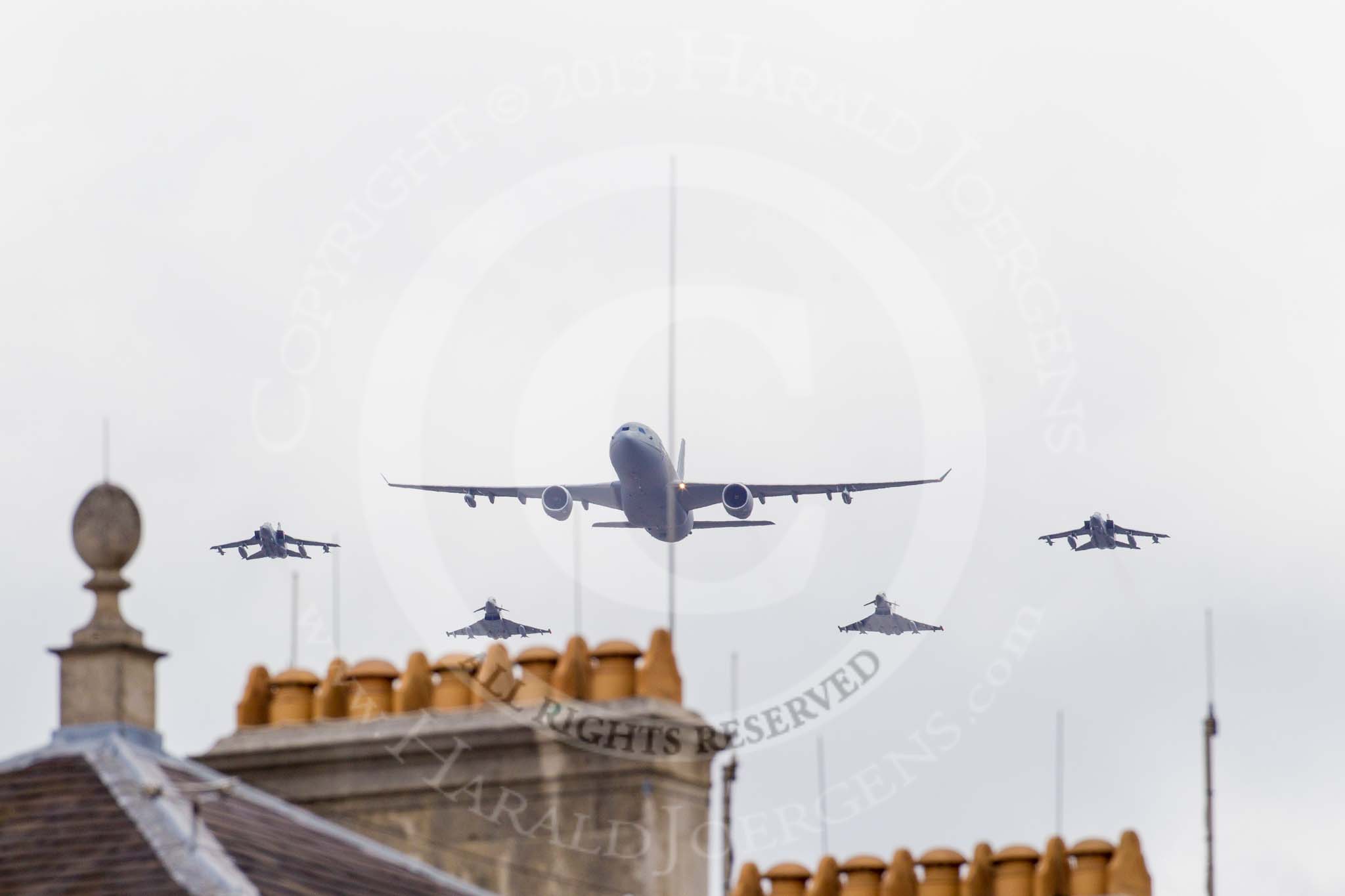 Trooping the Colour 2013: The RAF Flypast - Voyager, 2x Typhoon, and 2x Tornado GR4 on the outside of the formation. Image #922, 15 June 2013 13:02 Horse Guards Parade, London, UK