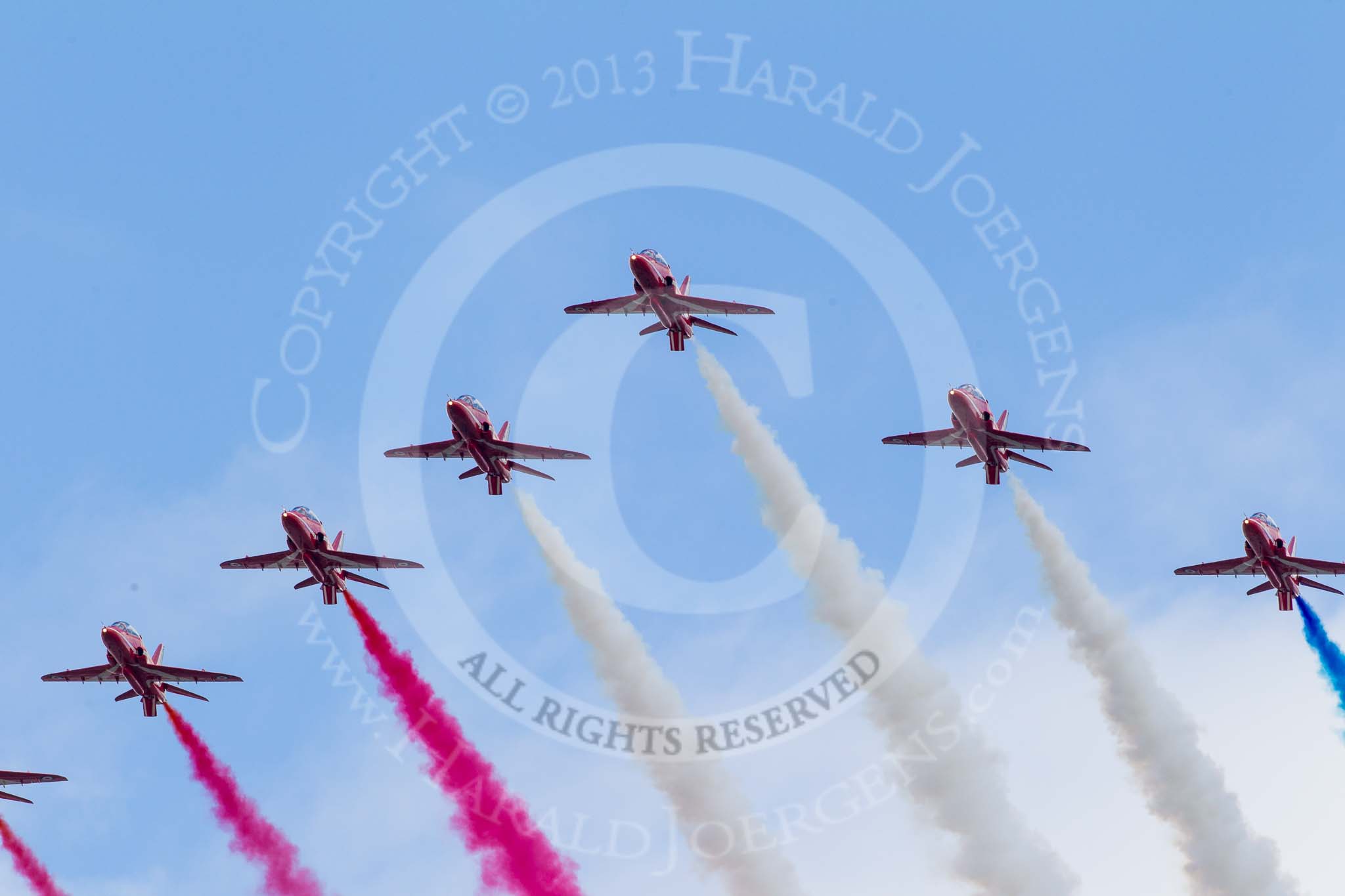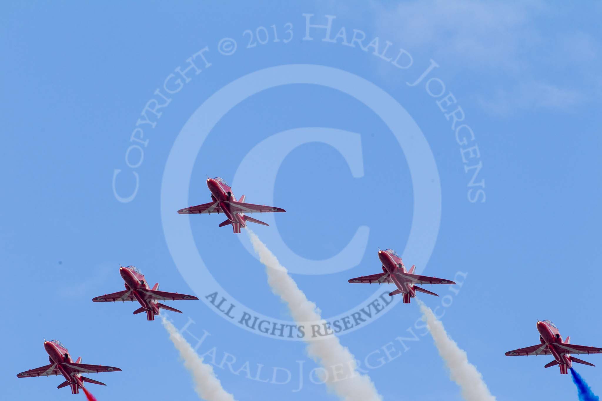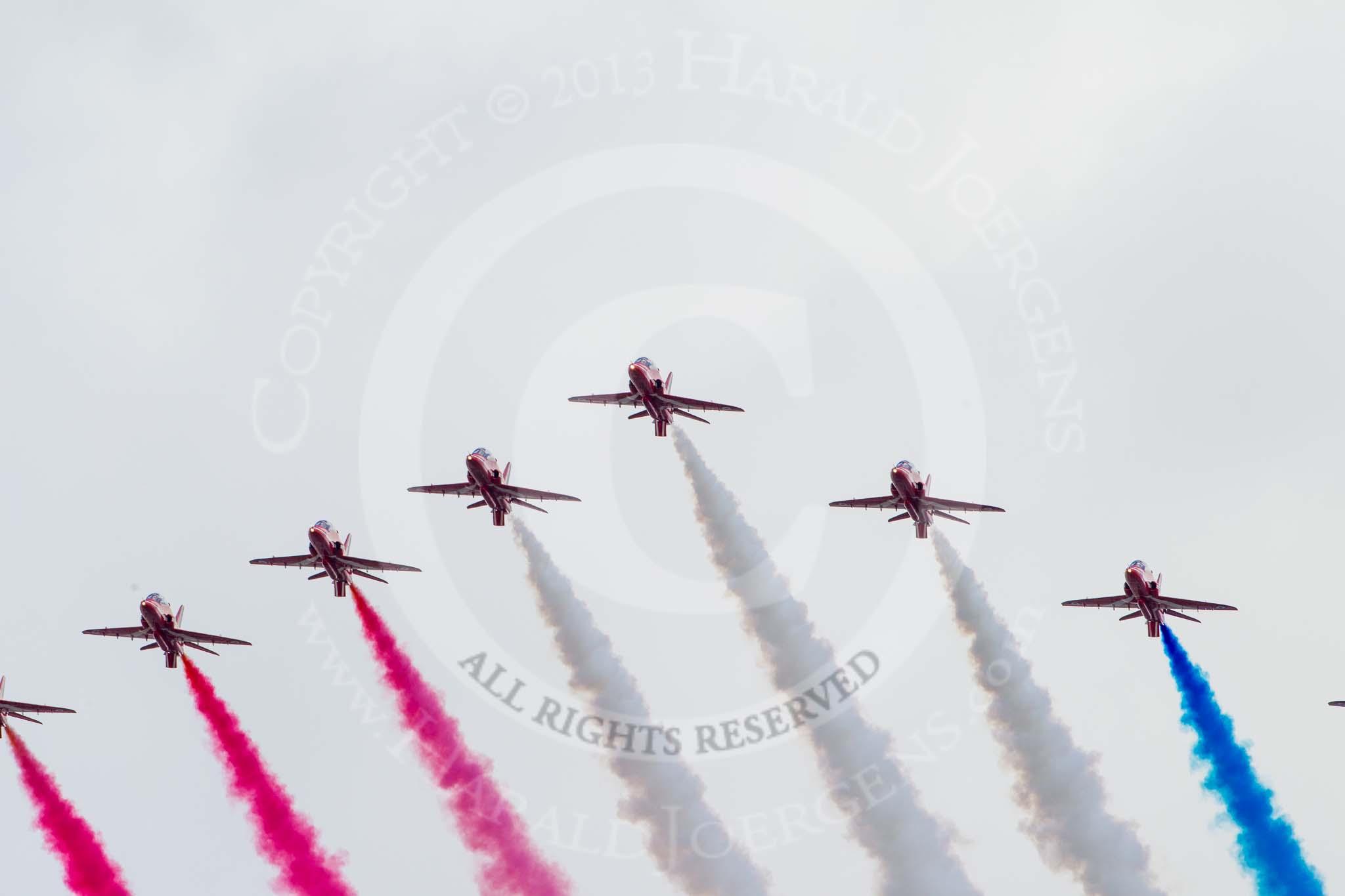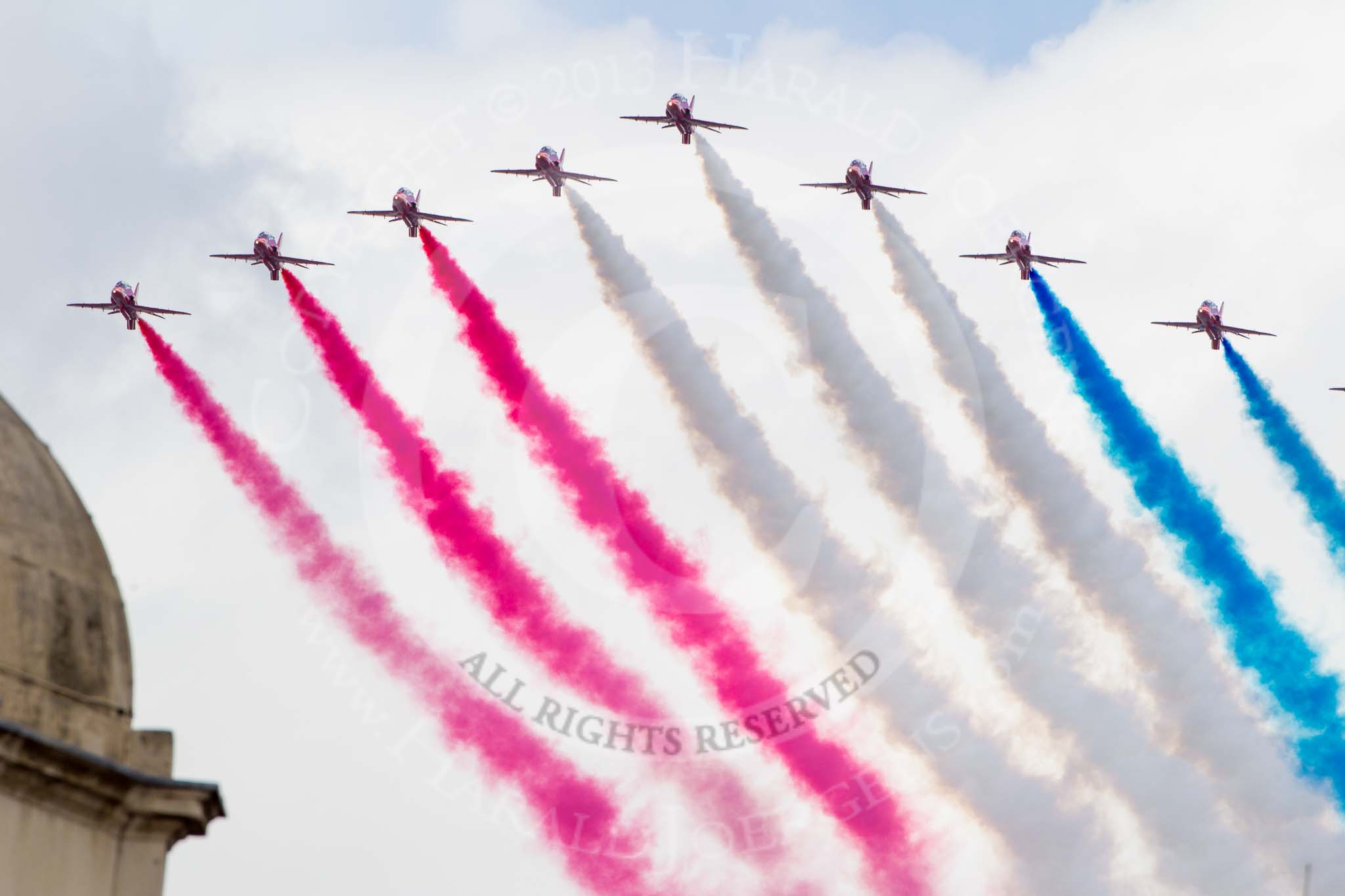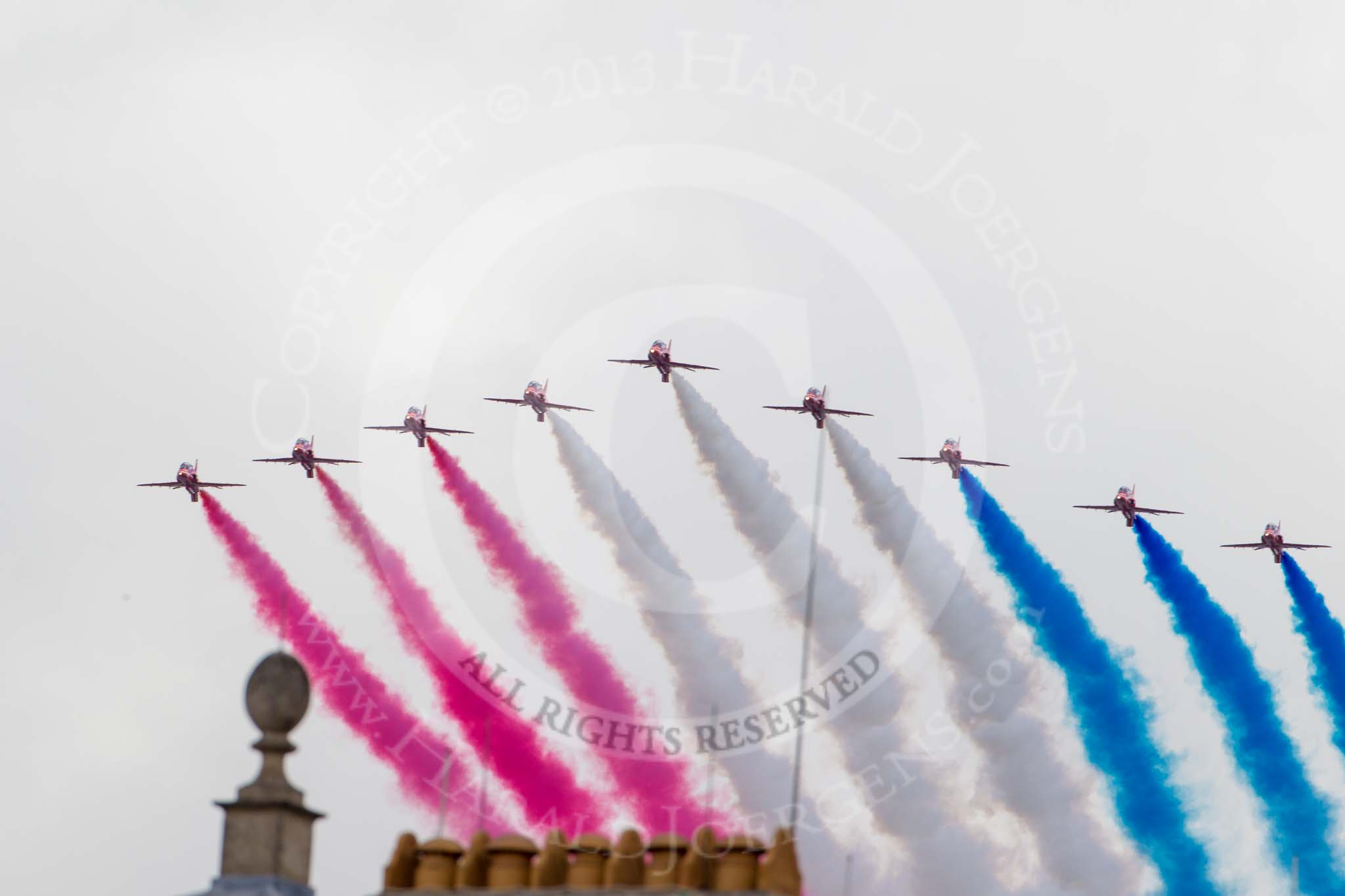 Trooping the Colour 2013: The RAF Flypast - the Red Arrows, red, white and blue smoke!. Image #924, 15 June 2013 13:03 Horse Guards Parade, London, UK