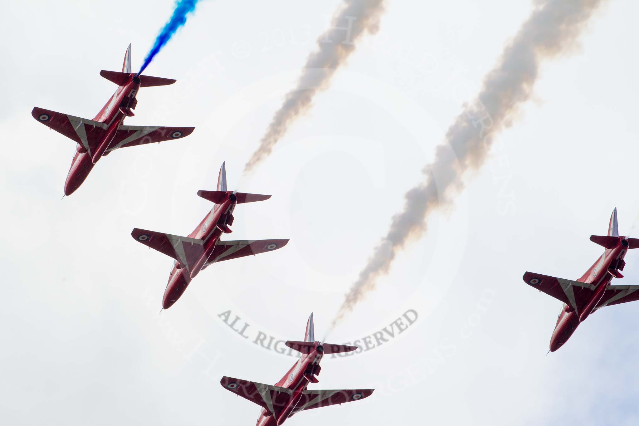 Trooping the Colour 2013: The RAF Flypast - the Red Arrows, red, white and blue smoke!. Image #932, 15 June 2013 13:03 Horse Guards Parade, London, UK