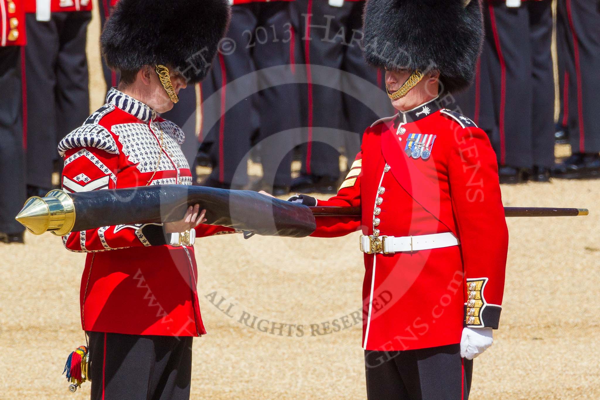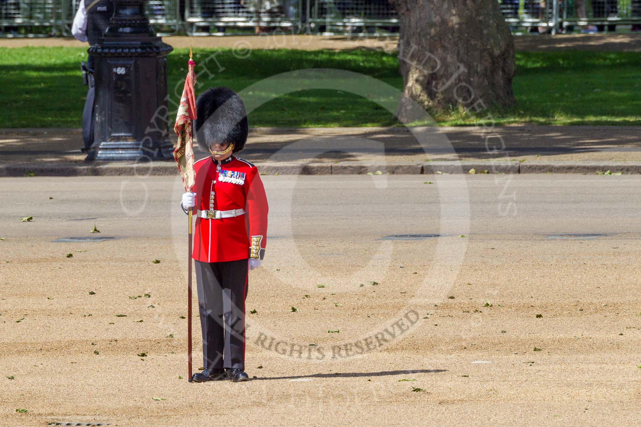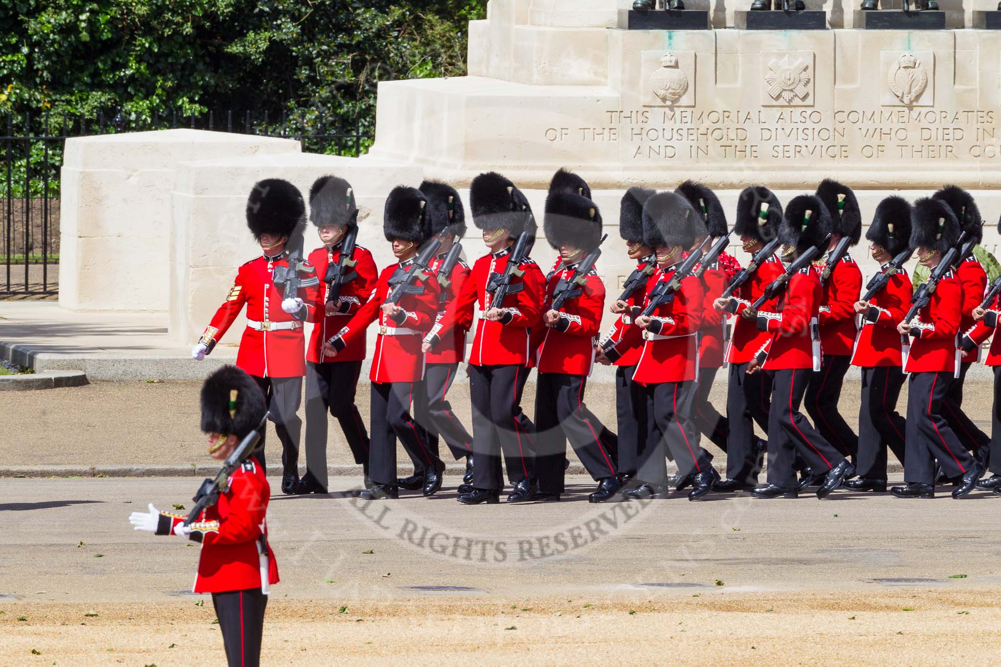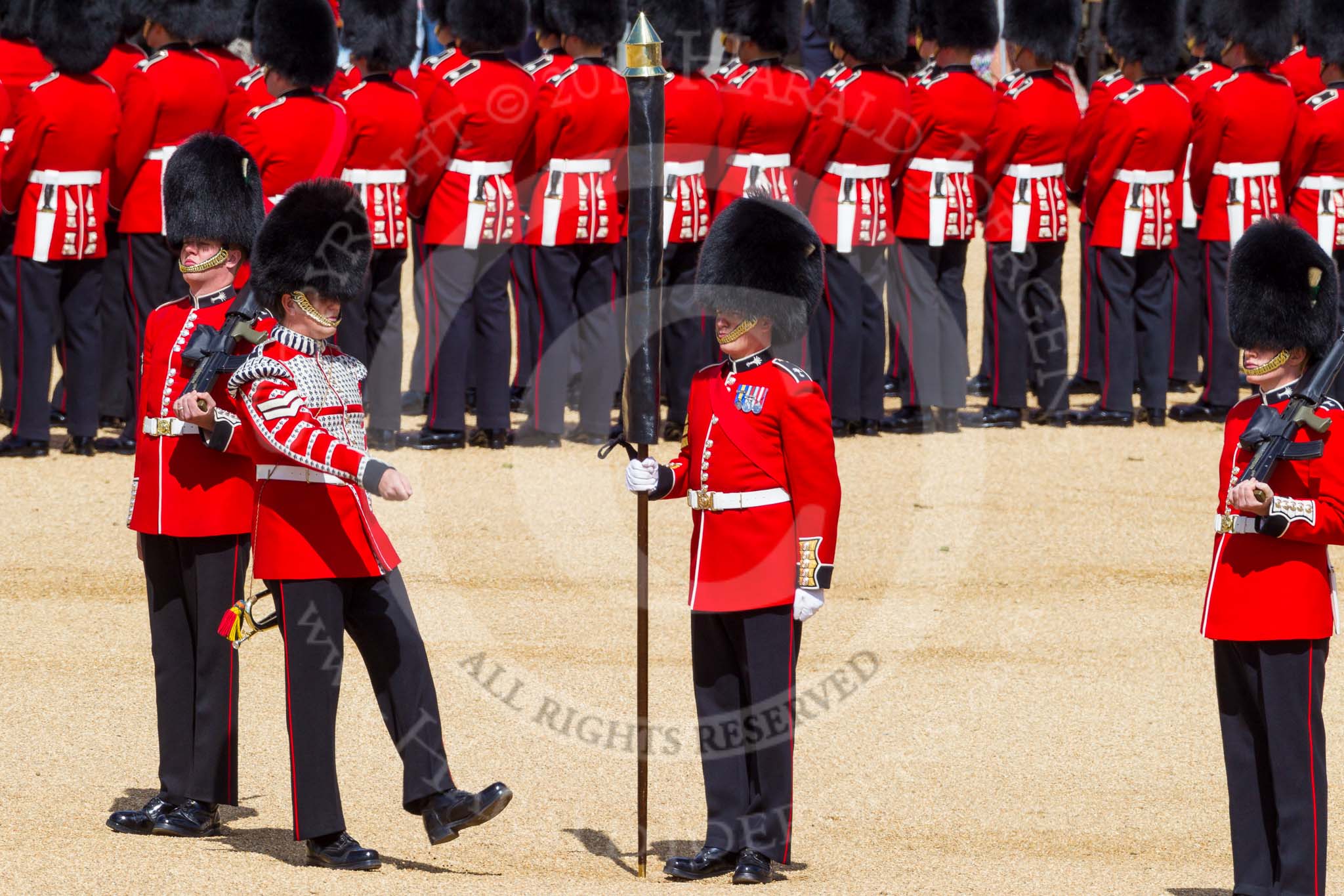 The Colonel's Review 2015: The uncasing of the colour. From left to right: Sentry Lance Corporal Purvis, drummer Lance Corporal Wolfendon, Sergeant Cunningham with the colour, and sentry Lance Corporal Carr..