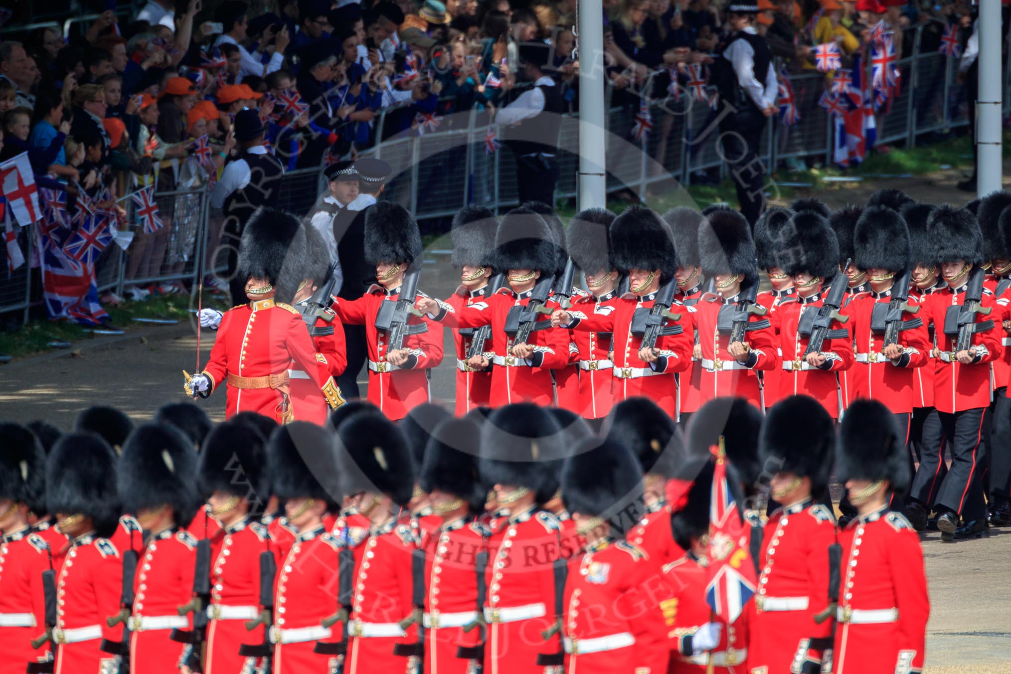 Number Four Guard, No 7 Company Coldstream Guards, led by The Subaltern, Captain James Potter (27), marching behind Number Five Guard, Nijmegen Company, Grenadier Guards during Trooping the Colour 2018, The Queen's Birthday Parade at Horse Guards Parade, Westminster, London, 9 June 2018, 10:27.