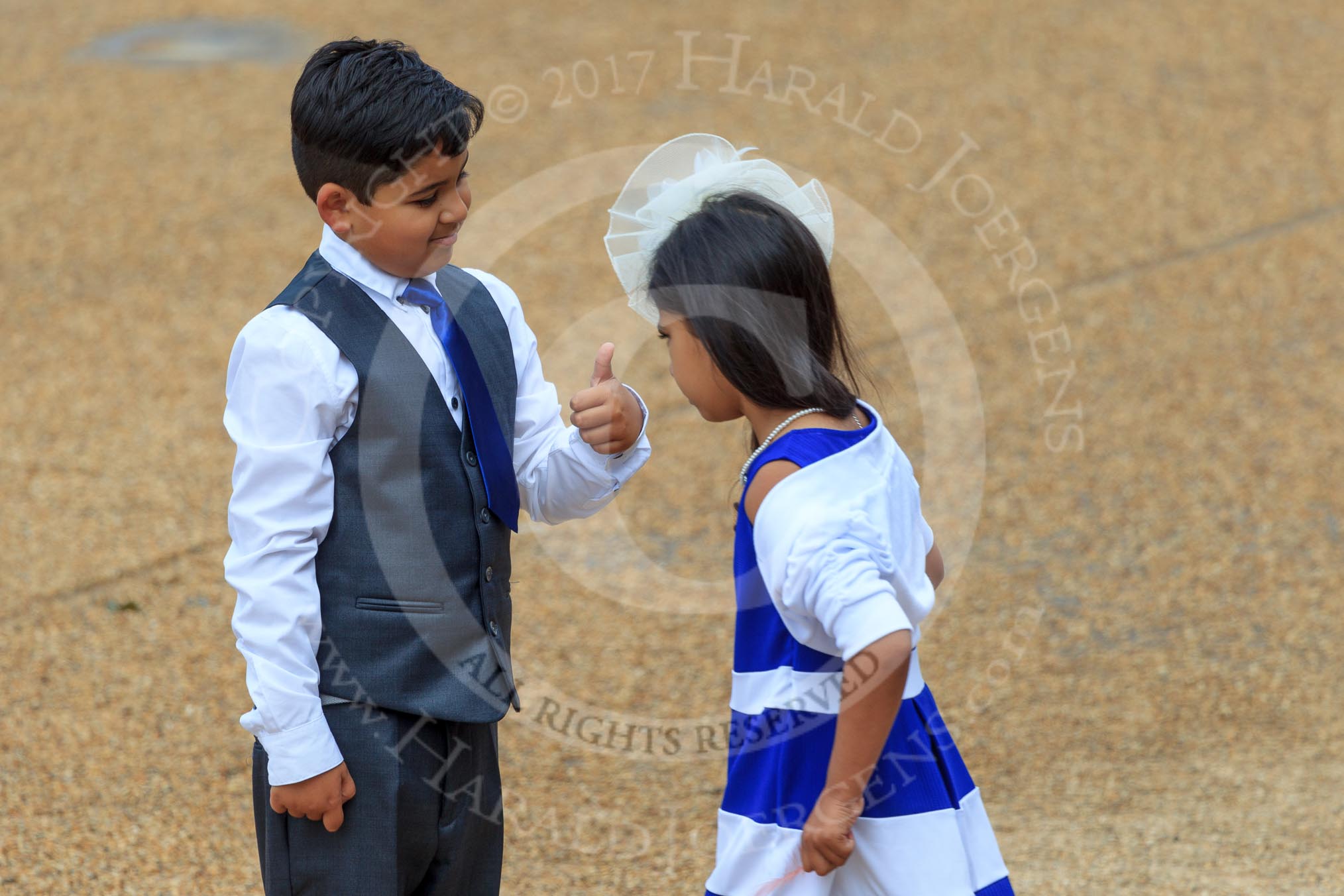 Smartly dressed boy and girl before Trooping the Colour 2018, The Queen's Birthday Parade at Horse Guards Parade, Westminster, London, 9 June 2018, 09:35.