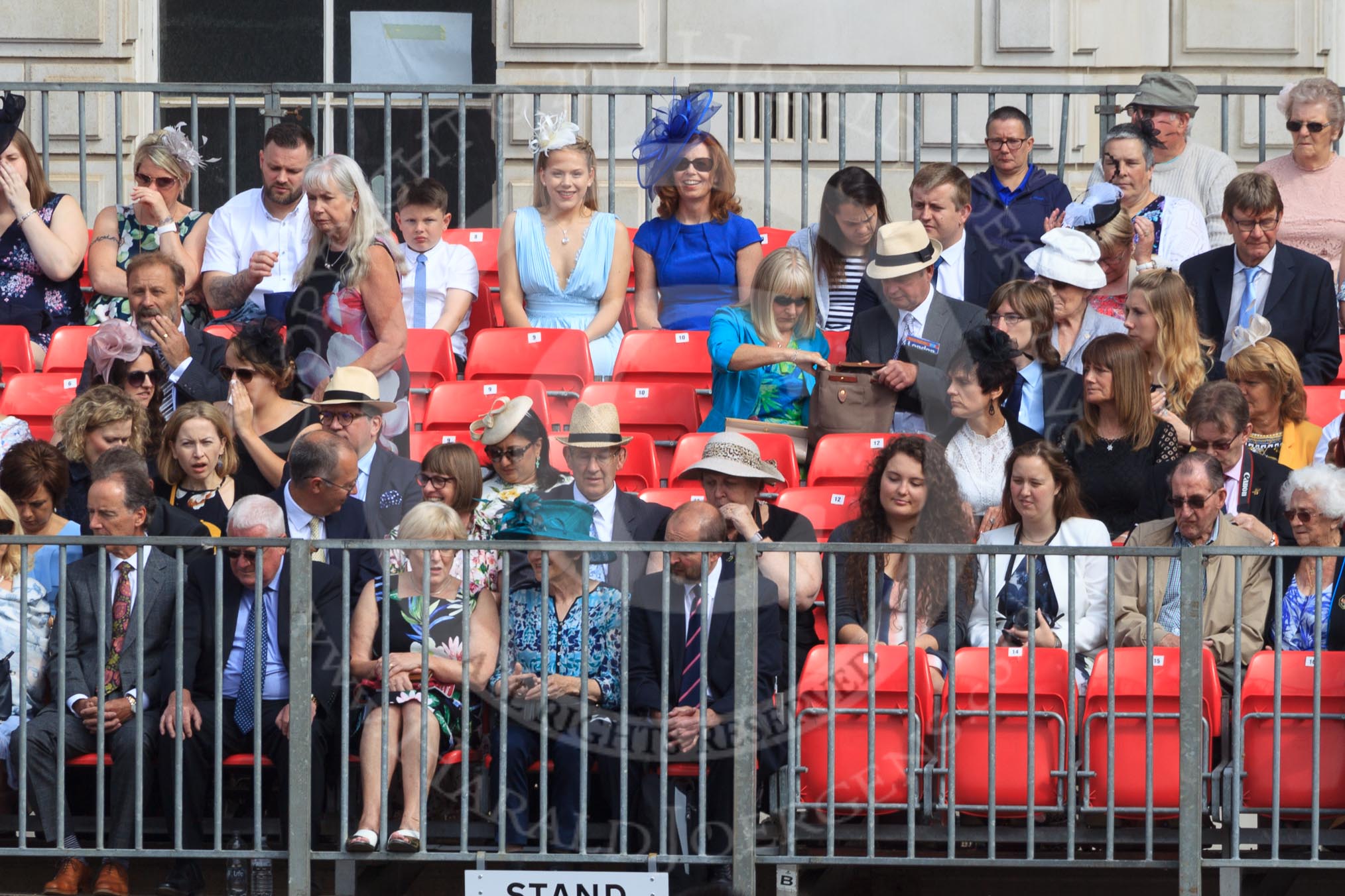Grand stand C, with smartly dressed spectators, before Trooping the Colour 2018, The Queen's Birthday Parade at Horse Guards Parade, Westminster, London, 9 June 2018, 09:46.