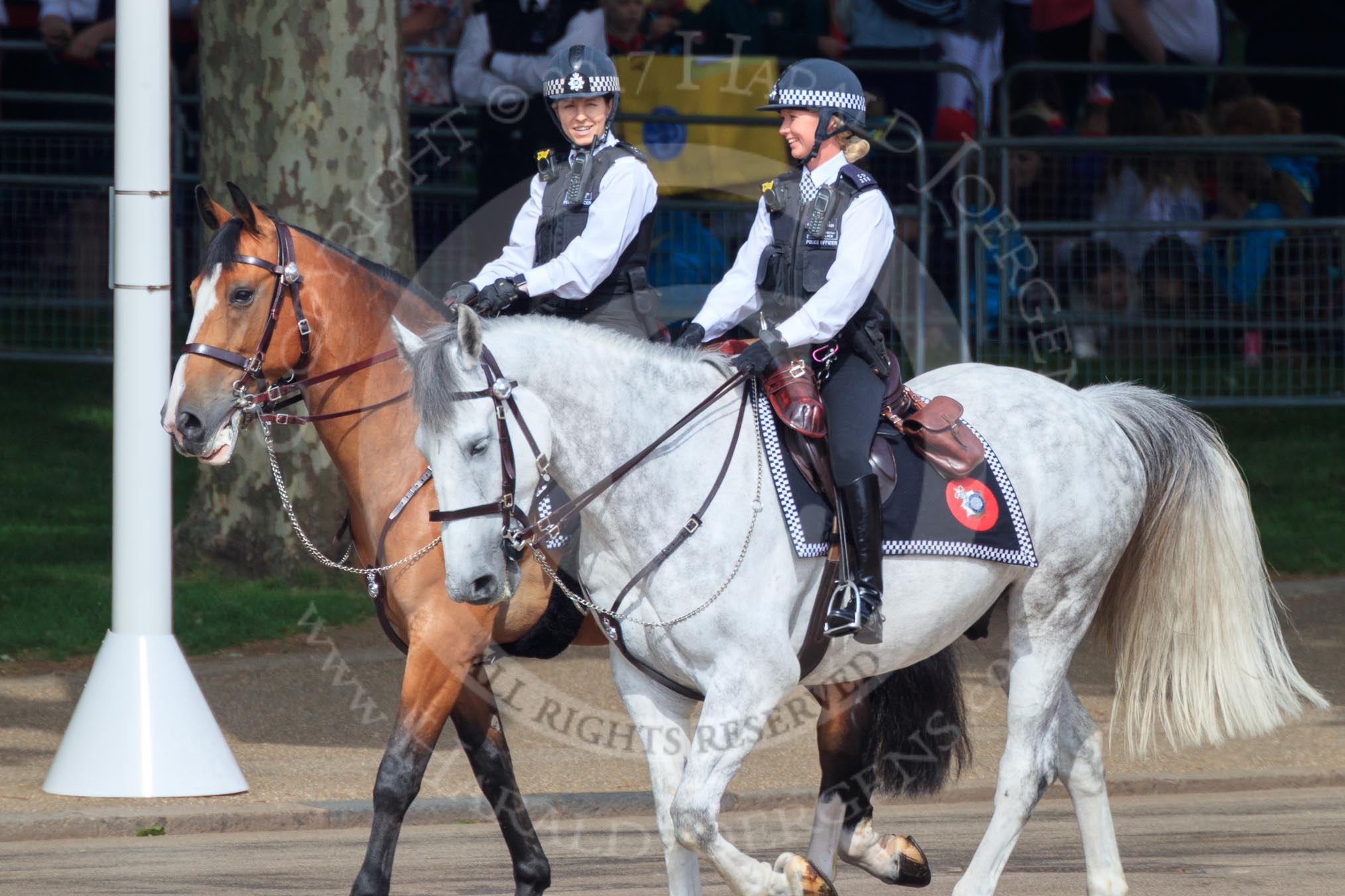 Two female Metropolitan Police officers on horseback, riding past the Youth Enclosure, before Trooping the Colour 2018, The Queen's Birthday Parade at Horse Guards Parade, Westminster, London, 9 June 2018, 09:47.