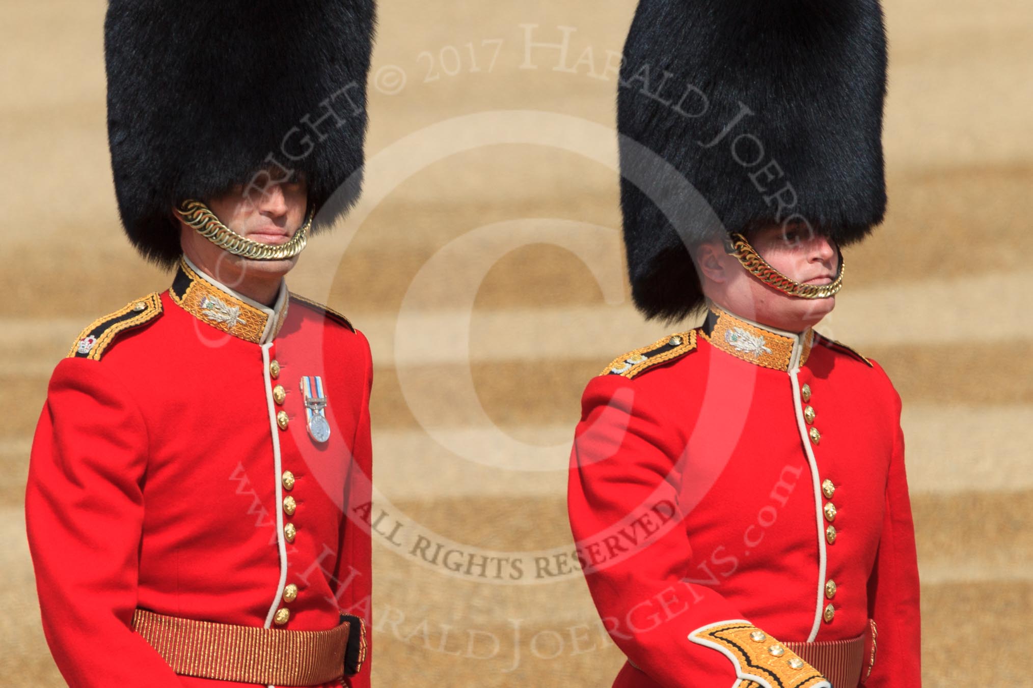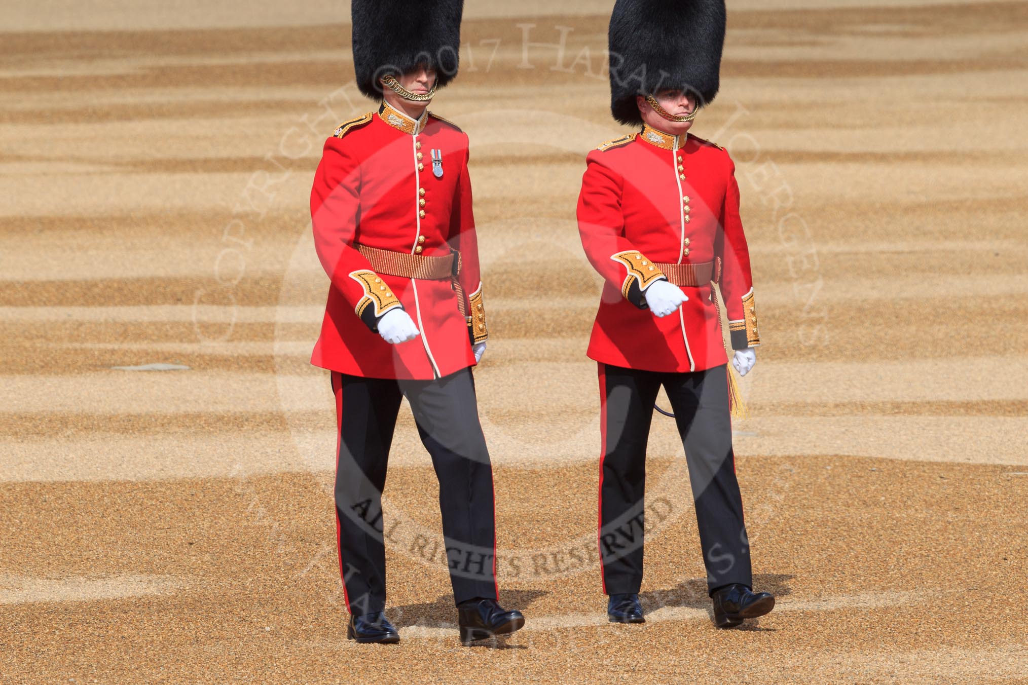 The Captain of the Guard, Major Tom F W Mortensen and The Ensign, Lieutenant Thomas Strachan (26), Number Six Guard, F Company, Scots Guards, before Trooping the Colour 2018, The Queen's Birthday Parade at Horse Guards Parade, Westminster, London, 9 June 2018, 09:54.