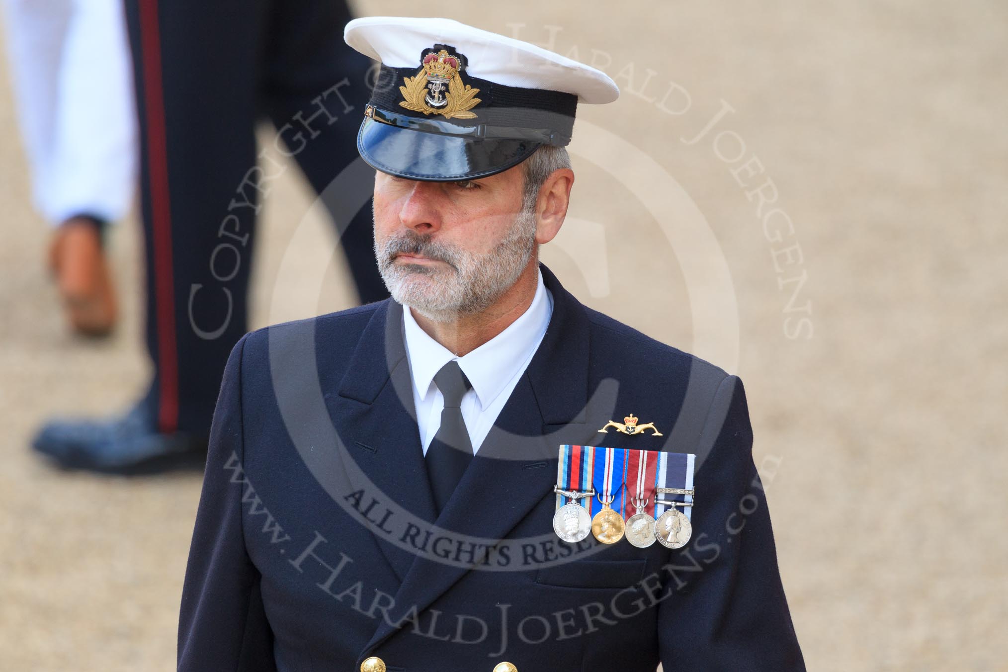 The Captain of the Escort to the Colour, Major JW Coleby, 1st Battalion Coldstream Guards, The Captain of the Guard, Major B Kemsley, Number Two Guard, 1st Battalion Coldstream Guards, and The Captain of the Guard, Major FGC Johnston, Number Three Guard, 1st Battalion Coldstream Guards, before Trooping the Colour 2018, The Queen's Birthday Parade at Horse Guards Parade, Westminster, London, 9 June 2018, 09:53.